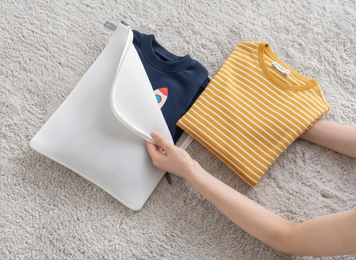 大切なのは、洗濯中の摩擦や衝撃を抑え、取り出した時点で形を整えやすくすること。生地同士の絡みを防ぐことで、シワや型くずれを軽減し、たたみ・収納までをスムーズにします。
