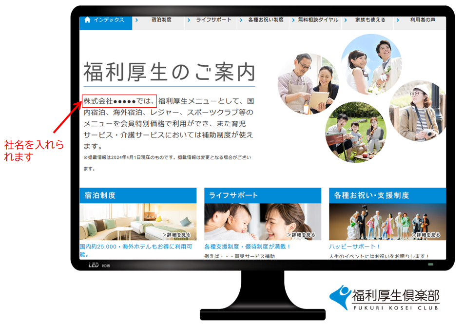 福利厚生倶楽部が用意するURLには、サブディレクトリに貴社名をいれることができ、そのURLを貴社の採用ページにリンクするだけで表示することが可能です。また、表示されるサイトTOPには貴社名(団体名)も表示できます。
