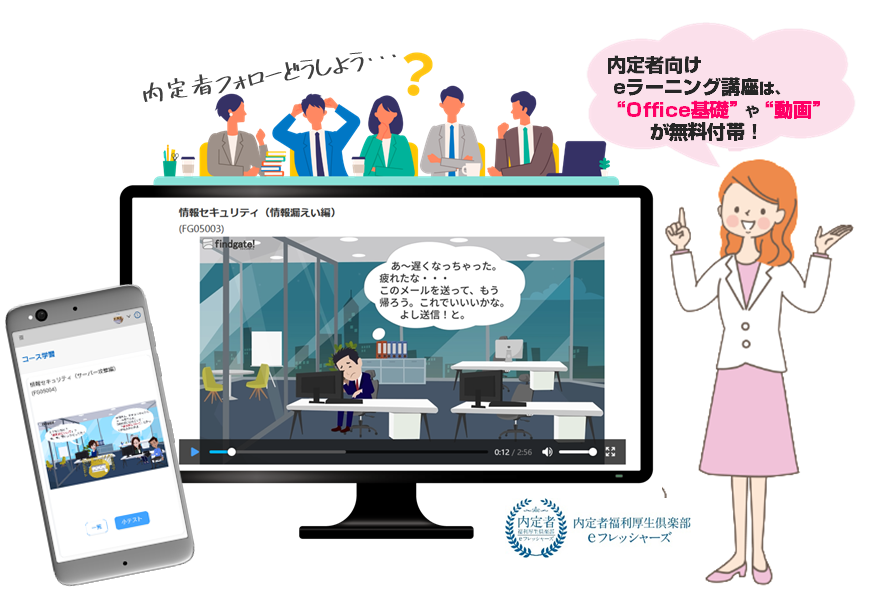 また、『内定者福利厚生倶楽部』には、動画によるビジネスマナーや、Office基礎などのeラーニングも付帯されており、自社単独では手間も費用もかかる施策が、全て無料で用意されています。※1