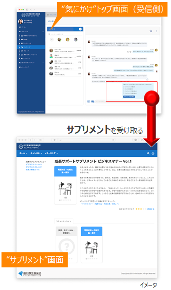 さらに、“気にかけ機能”のメッセージに連動した、成長のためのサプリメント(ショートコンテンツ)を受け取ることができ、成長のヒントからeラーニングへの誘導もできます。