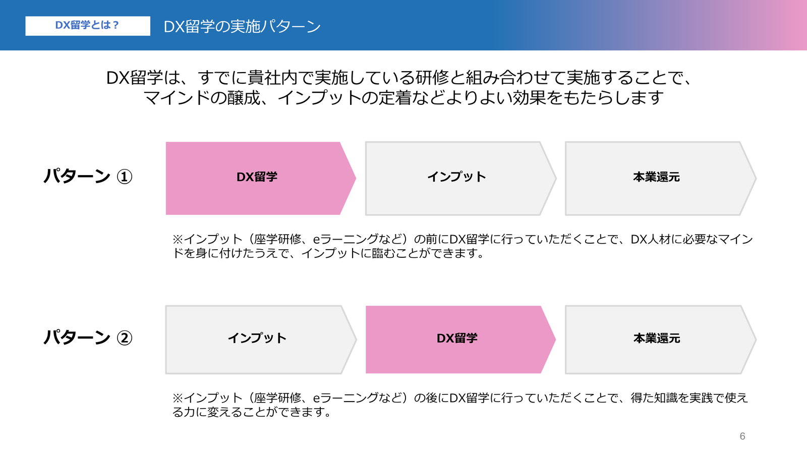 DX留学では、①DX系ツールやコンサルティングを提供しているベンチャーでの実践、もしくは②中小企業のDXプロジェクトへの参画機会を提供します。複業留学を通じて累計40社200名以上の支援を行ってきた経験を活かし、“現場で活躍する”DX人材の育成を支援します。