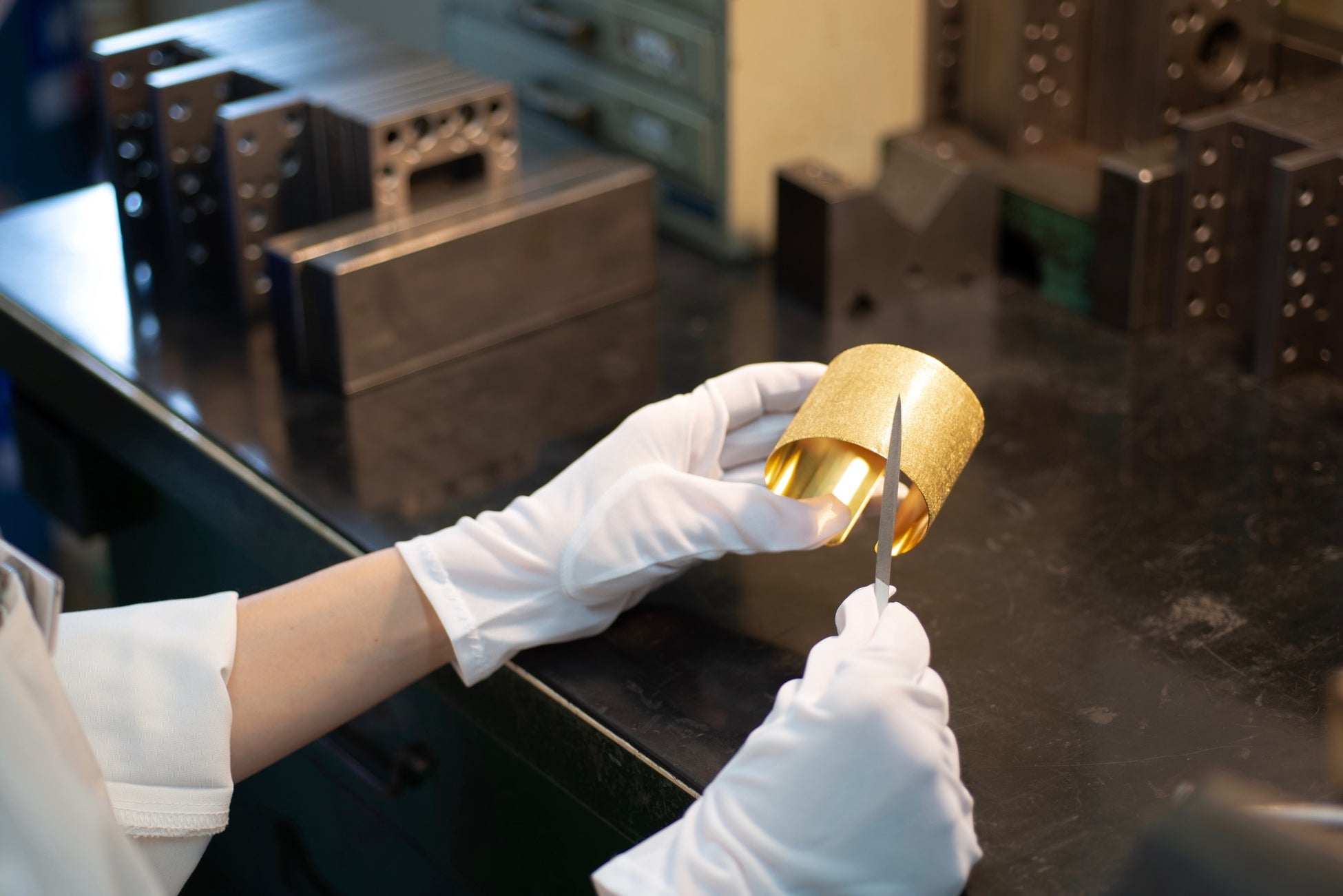 本素材には、⽥中貴⾦属⼯業の厳しい検査をクリアした高品位な純金24Kのみ採⽤しています。