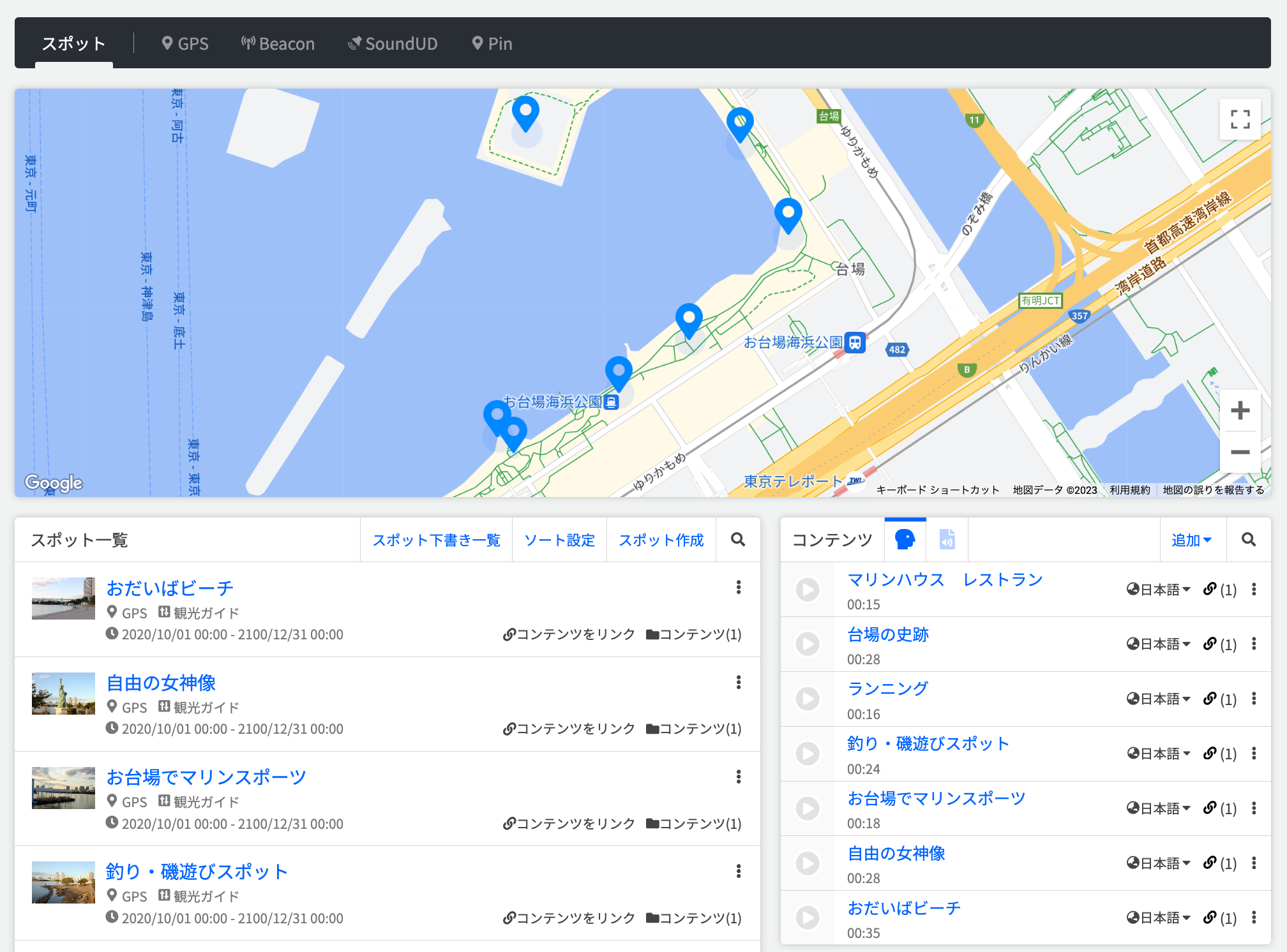 GPSによる音声スポットの設置と紐付け、音声コンテンツの合成や、自動翻訳、BGMの設定など