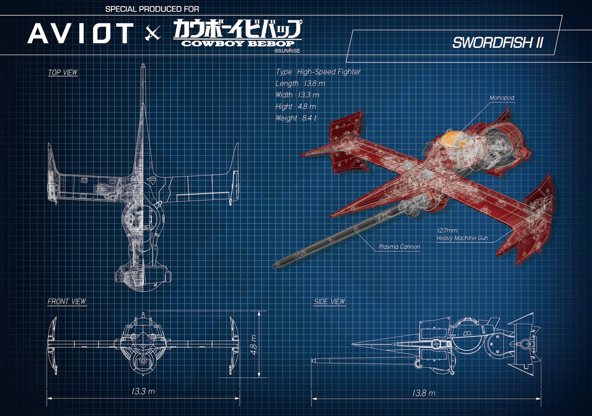 AVIOTのフラッグシップモデル「TE-ZX1」と『カウボーイビバップ』のタイアップに伴い、AVIOT協賛で製作した、同作に登場する高速戦闘機「ソードフィッシュⅡ」を展示いたします。メカニカルデザイン 山根公利氏監修により、細部まで徹底的にこだわった迫力満点の「ソードフィッシュⅡ」を、どうぞお見逃しなく。