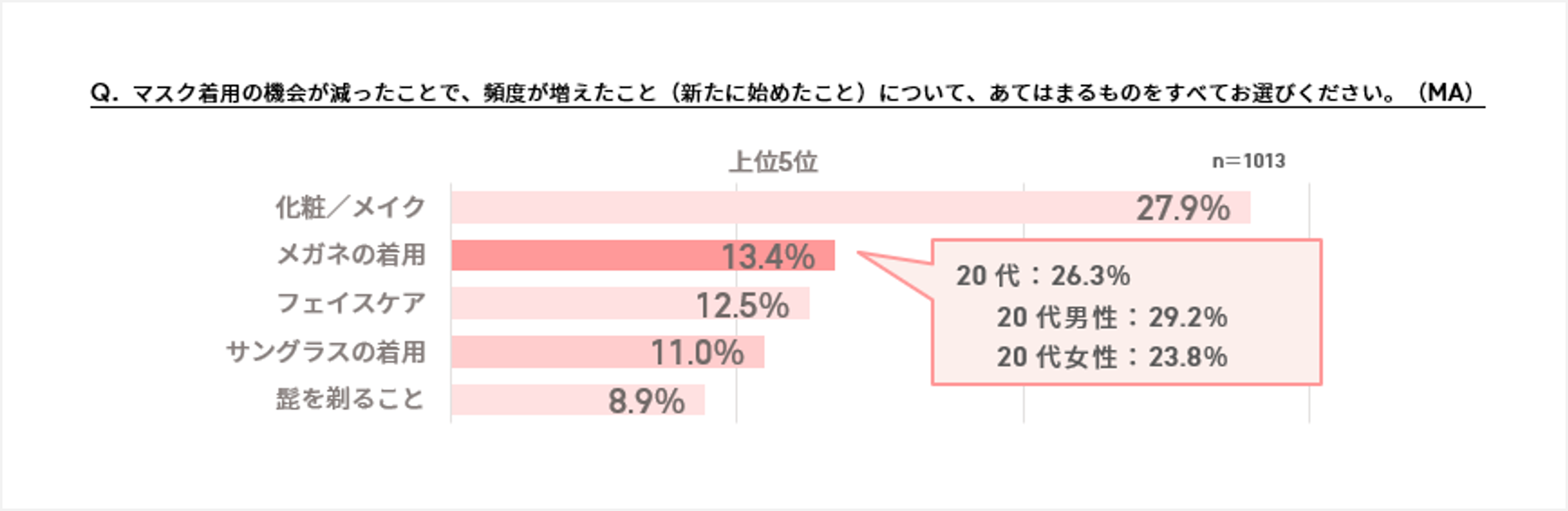 前述で「マスク着用が減った」と回答した人に、頻度が増えたこと(新たに始めたこと)を聞いたところ、最も多かった「化粧/メイク」(27.9%)に次いで「メガネの着用」(13.4%)があがった。年代別では20代が最も高く、20代の男性は約3割が、20代の女性は約2割の人が回答。