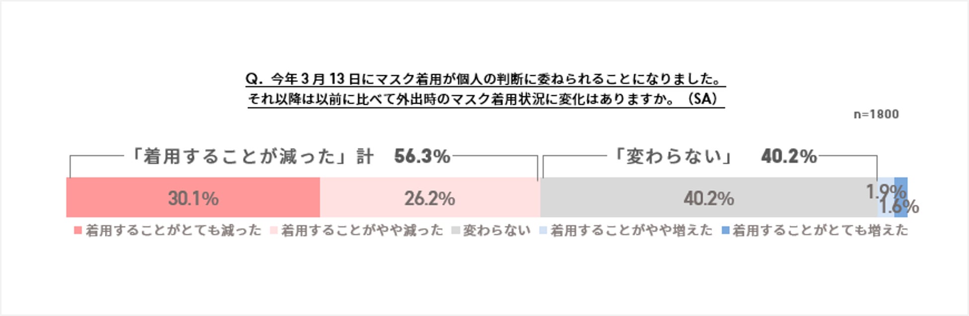 「着用することがとても減った」と「着用することがやや減った」と合わせると過半数の56.3%の人が、マスク着用が減ったと回答。一方で40.2%の人が「変わらない」と回答。