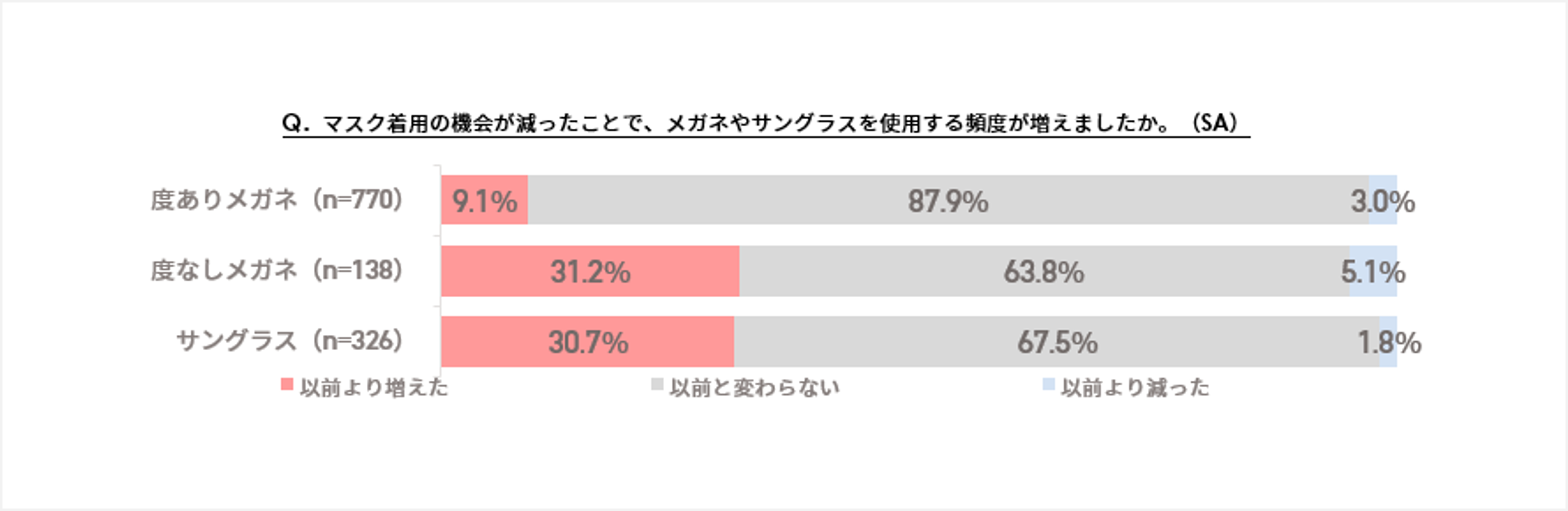「度ありメガネ」は89.7%が「以前と変わらない」だが、「度なしメガネ」は31.2%、「サングラス」は30.7%が「以前より増えた」と回答。
