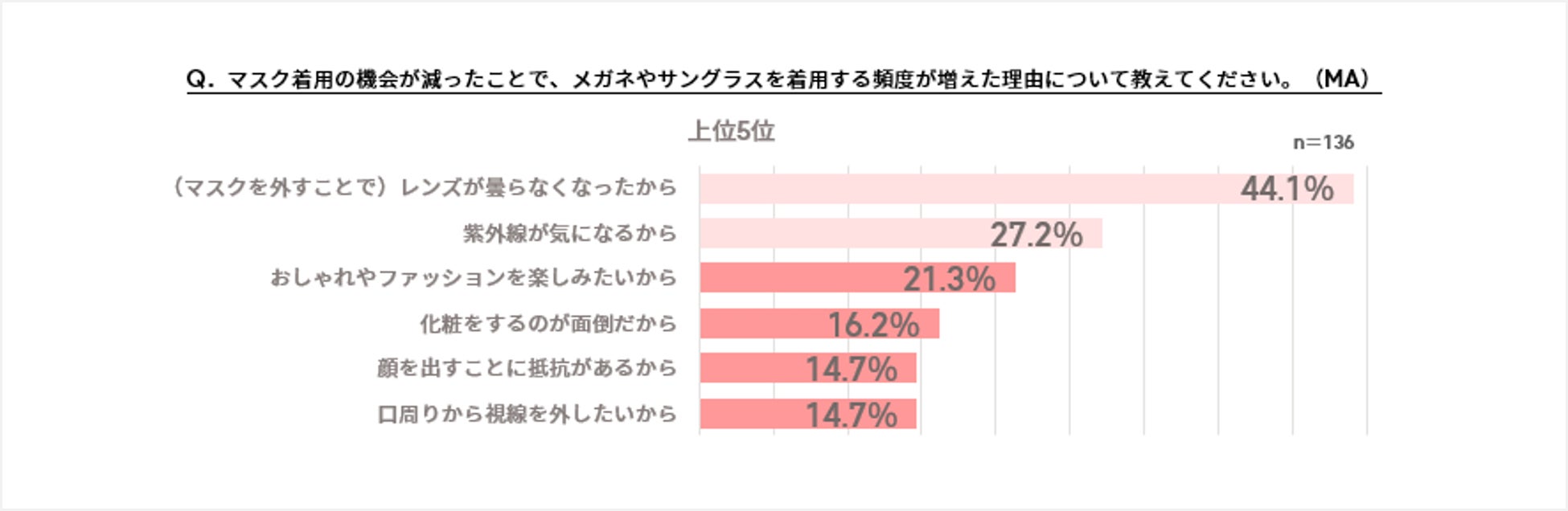 前述で「メガネの着用」と回答した人にその理由を聞いたところ、最も多かった「レンズが曇らなくなった」(44.1%)に次いで「紫外線が気になるから」(27.2%)、「おしゃれやファッションを楽しみたいから」(21.3%)と続く。「化粧をするのが面倒だから」「顔を出すことに抵抗があるから」「口周りから視線を外したいか