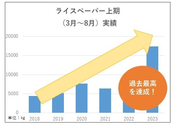 ライスペーパーの出荷数量では、2019年上期(3-8月)から2023年上期(3-8月)で3.4倍、 過去最高の売上を達成しました。