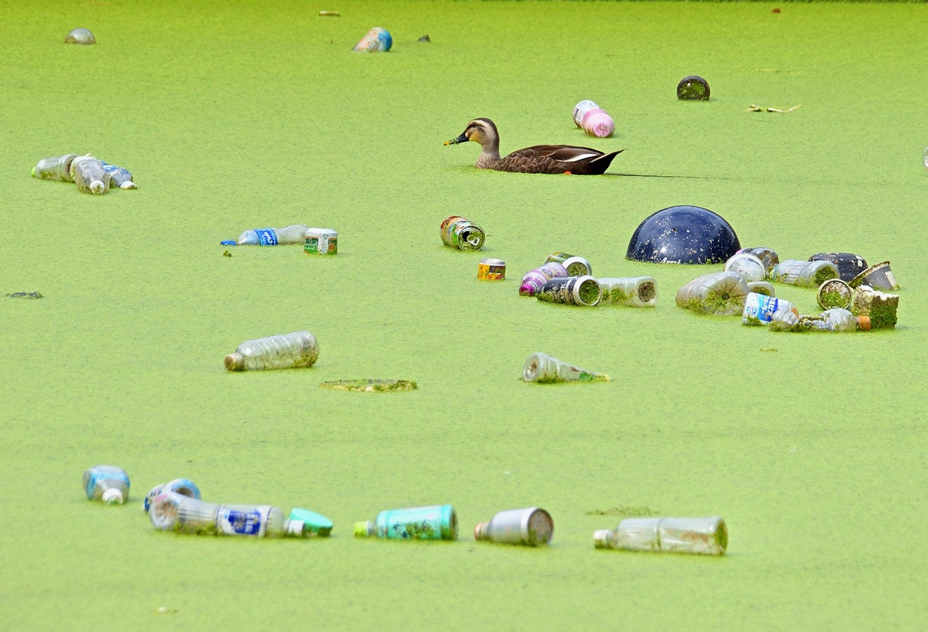 エピソード:貯水池には多くの捨てられた空き缶やペットボトルが浮いていました。よく見るとカモが泳いでいました。こんな現状を見て、何を思っているのでしょうか?
