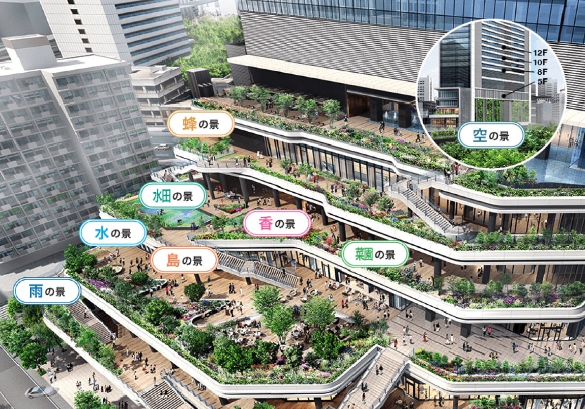 東京ポートシティ竹芝では、施設内のスキップテラス他において「雨・水・島・水田・香・菜園・蜂・空」の8つの「竹芝新八景」を展開し、生物とのふれあい・農体験などを通して、環境教育や環境負荷の低減、来街者や地域住民、オフィス入居者への生物多様性への認知と理解の向上を図っています。また、緑豊かな環境づくりに努めると同時に、環境教育、地域交流、情報発信を行い、生物多様性の取り組みを発信しています。