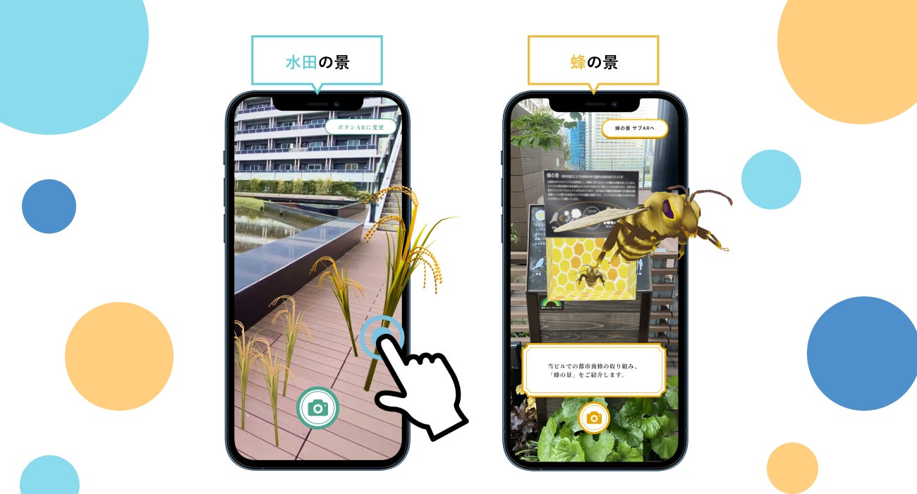 メインコンテンツ:5階スキップテラスの案内板にカメラを向けることで、都市養蜂がもたらす都心の生態系への影響などについてARで体験いただけます。