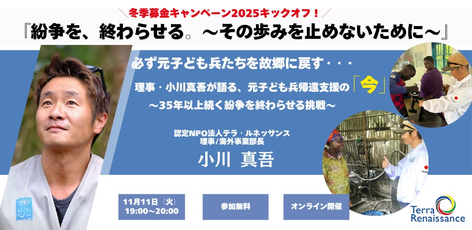 認定NPO法人テラ・ルネッサンス(理事長:吉田真衣、所在地:京都府京都市、以下テラ・ルネッサンス)は、アジア、アフリカ、ウクライナで紛争の被害を受けた方々の自立支援を行うため、2025年11月11日(火)~ 2026年1月15日(木)まで寄付を呼びかける冬季募金キャンペーン「紛争を、終わらせる。2025ーその歩みを止めないためにー」を実施します。