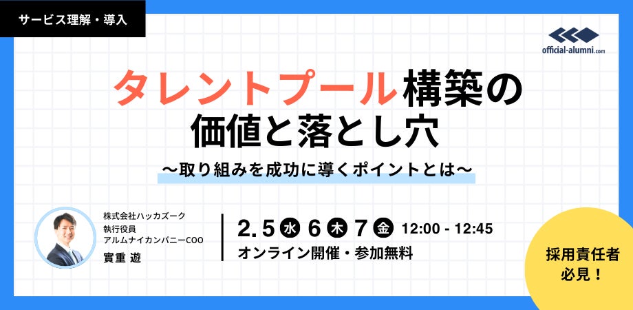 株式会社ハッカズーク(本社:東京都文京区、代表取締役グループCEO:鈴木仁志)は、2/5(水)・2/6(木)・2/7(金)12時00分より、タレントプール構築の価値と取り組みを成功に導くためのポイントについて解説する無料オンラインセミナーを実施することをお知らせいたします。