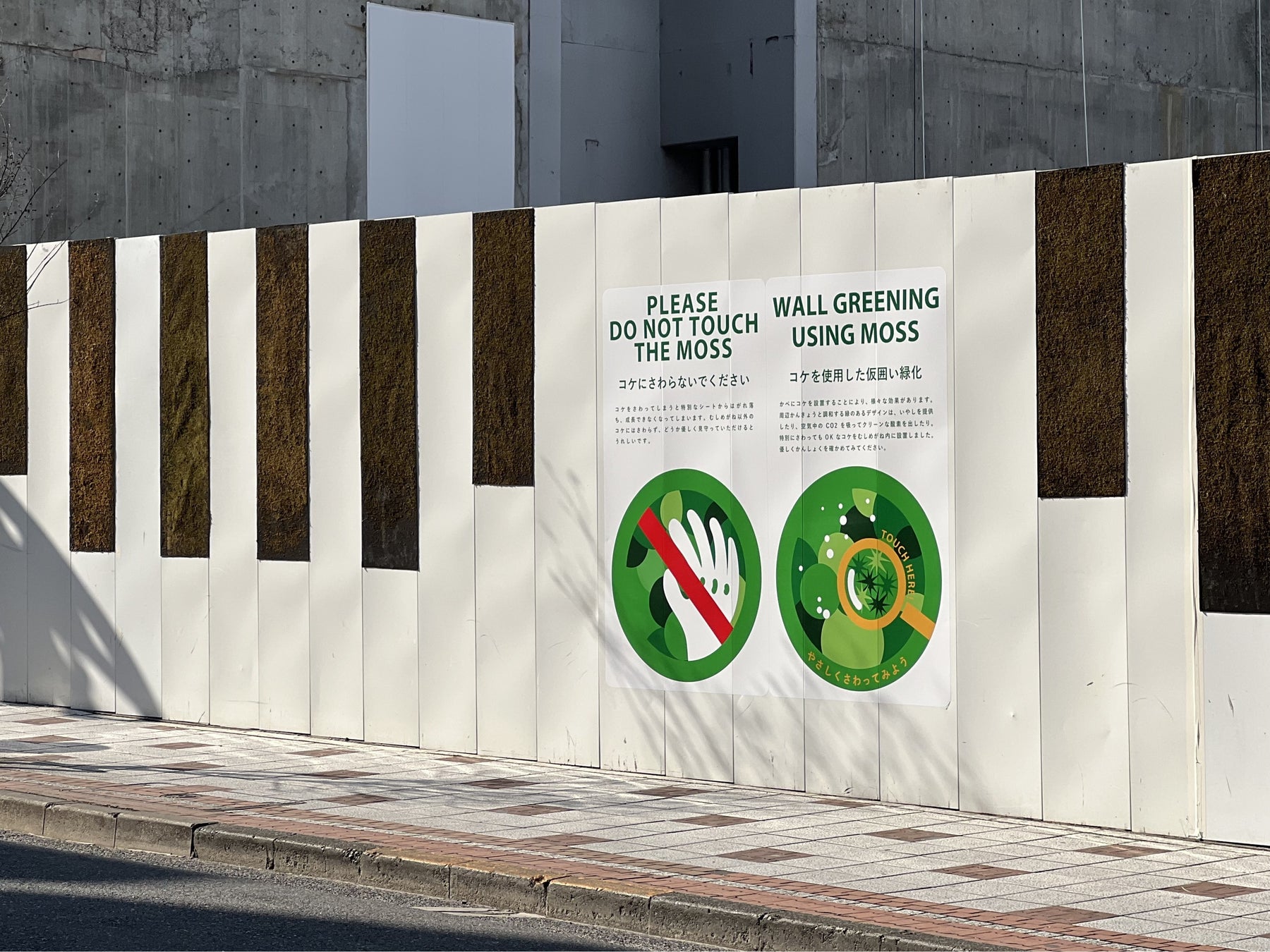 本プロジェクトの着工にあたり、キーコンセプトの「Tokyo’s Urban Retreat」に基づき、仮囲いを活用した緑視率向上に取り組んでいます。2024年12月より建設現場の仮囲いにて苔シートを活用した壁面緑化施策を実施中です。取り付け・取り外しが容易なマグネット式により、建設工程に合わせてフレキシブルなレイアウト変更に対応し、2025年3月12日現在、仮囲い面積約320㎡に対して、約130㎡の壁面緑化を実現しました。
