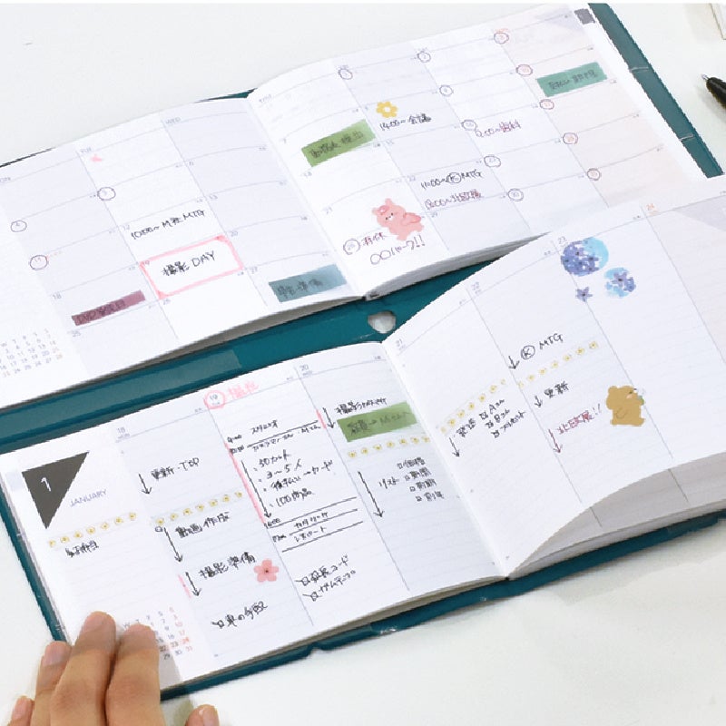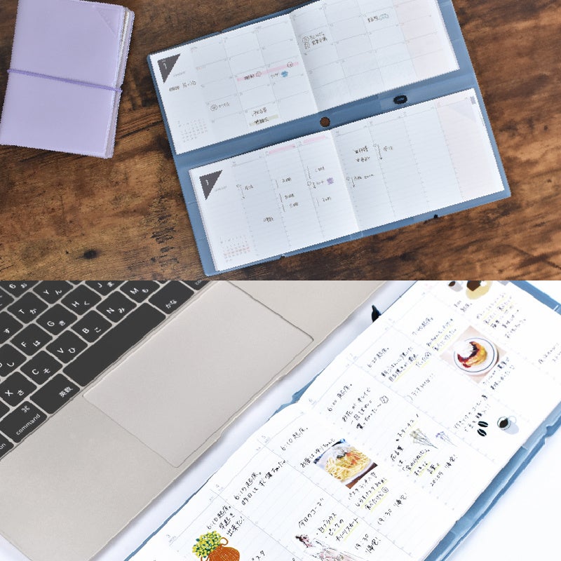 特長)手帳カバー上段に月間カレンダー、下段に日付フリーのデイリー手帳がセットされています。