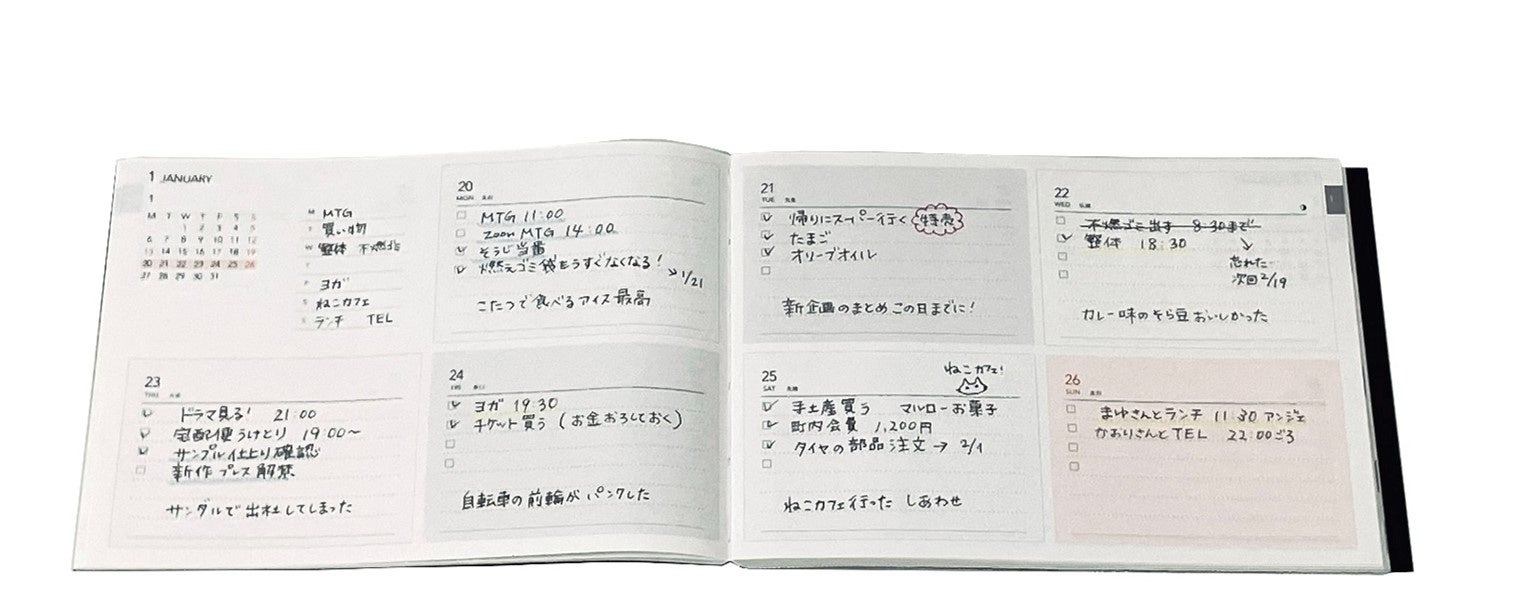 特長:コンパクトなA6横長サイズ。年間・月間・週間予定の確認やメモを素早くできる。