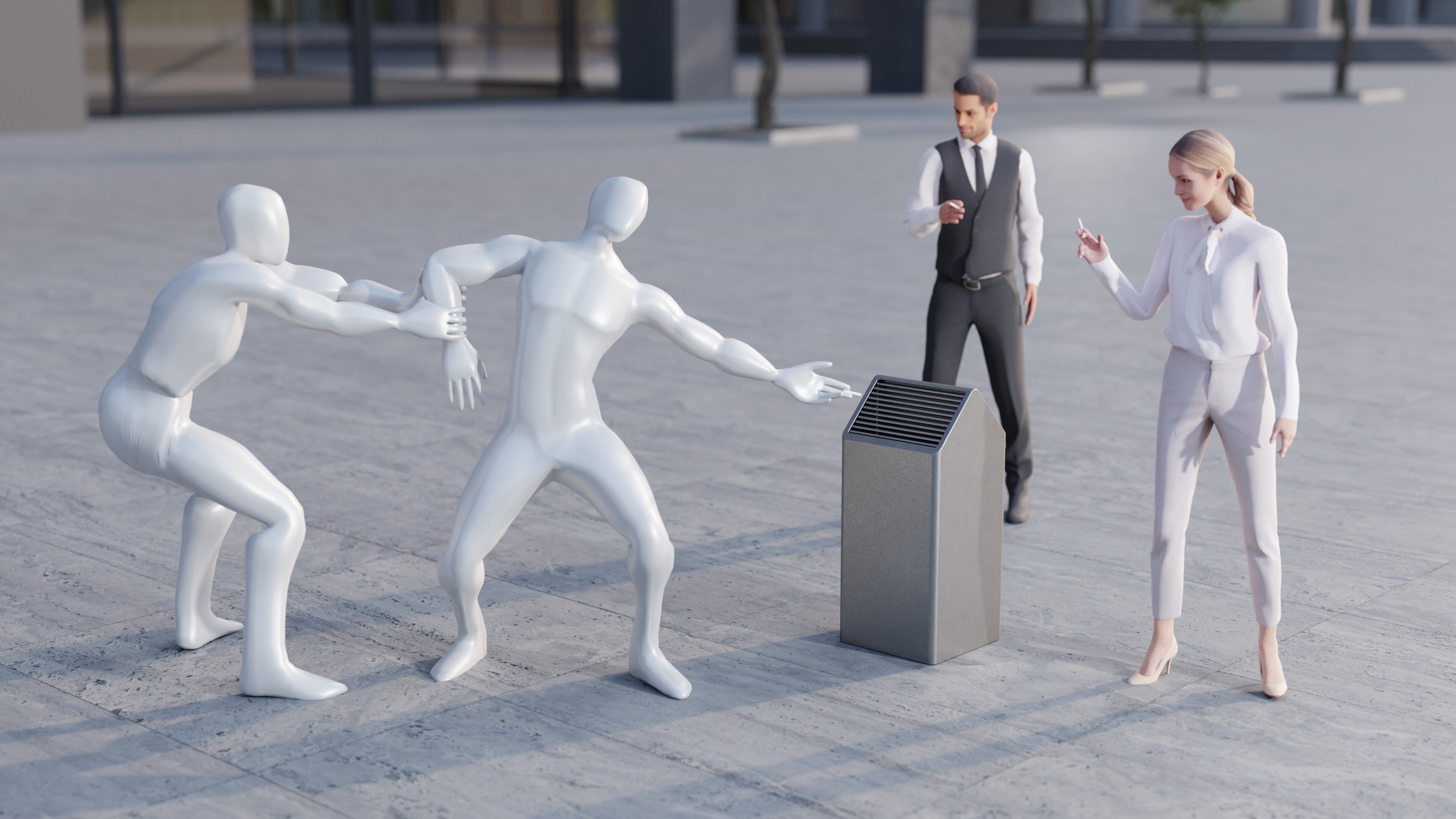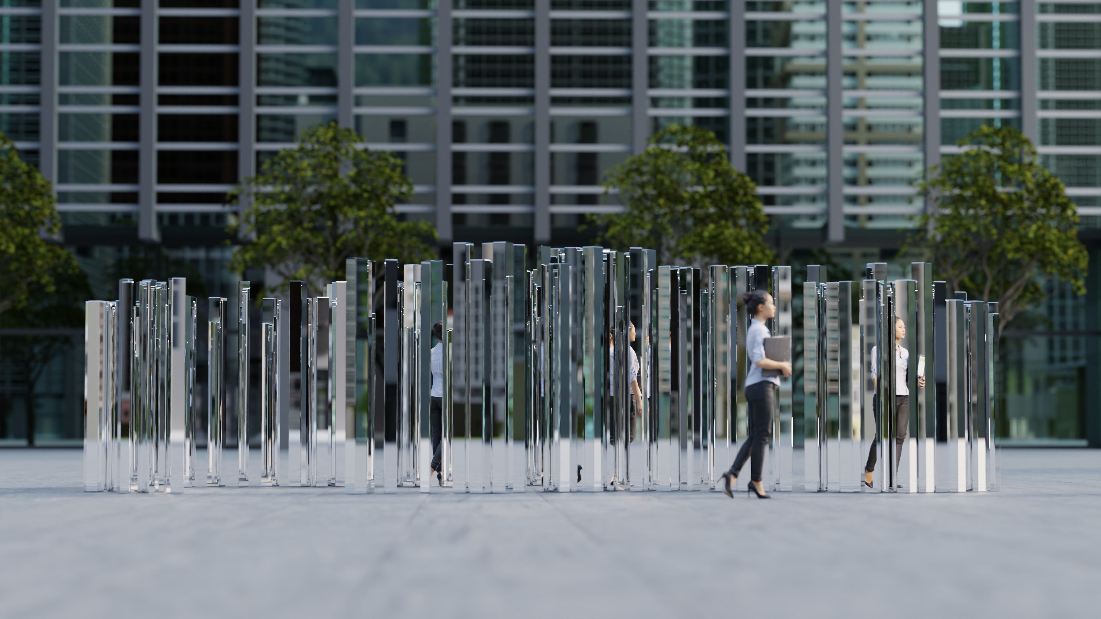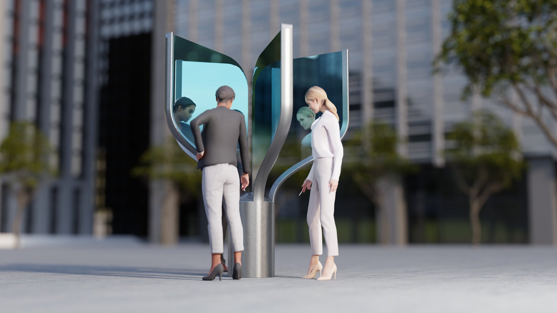 ミラーを用いた光学迷彩型喫煙所。光学迷彩を用いることで喫煙所が街の景観に溶け込むような仕掛けを施します。また、たばこを吸う人は周囲からの注目やミラーに映る自身の姿によって、今まで以上にマナーを守ろうとする意識が高まります。