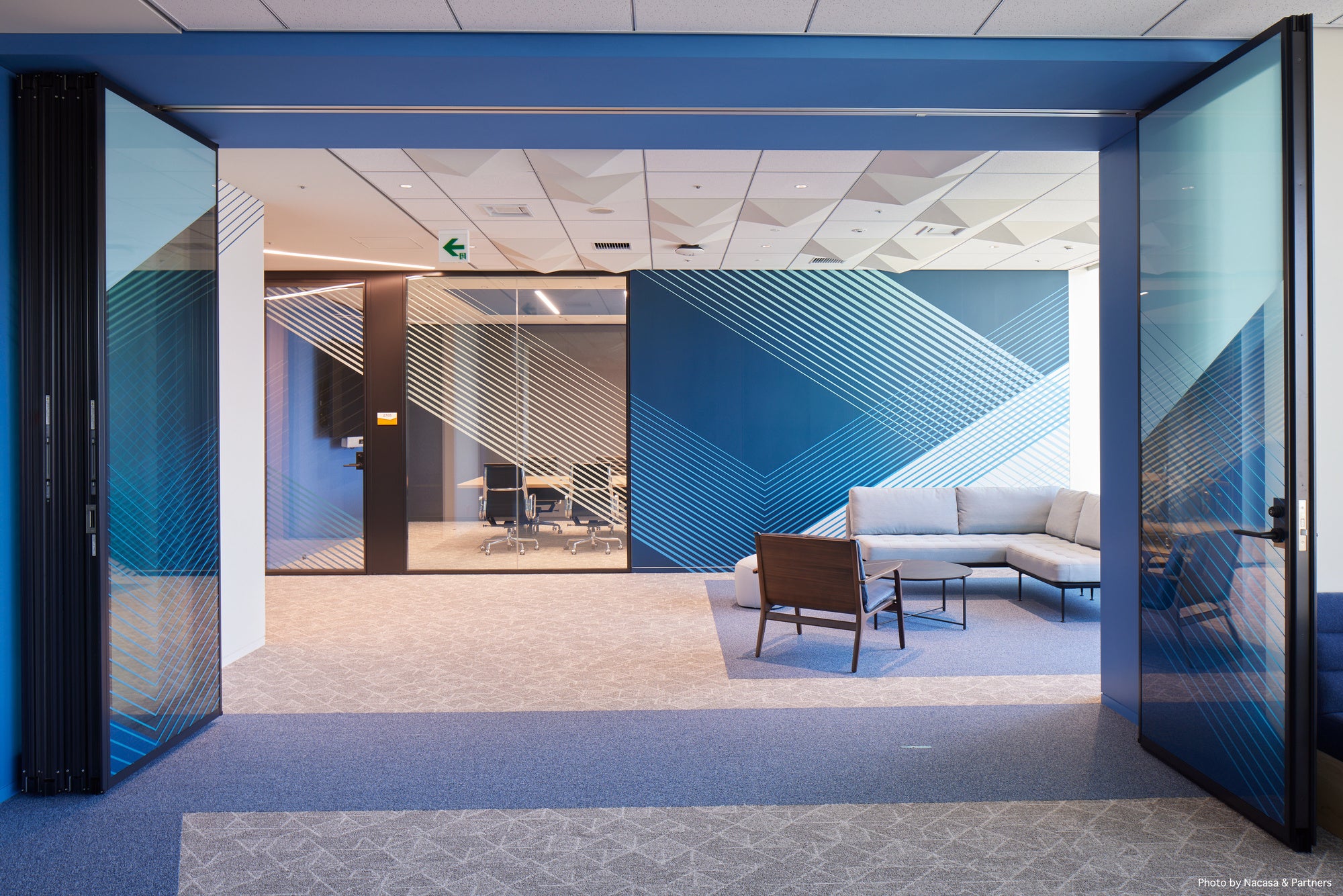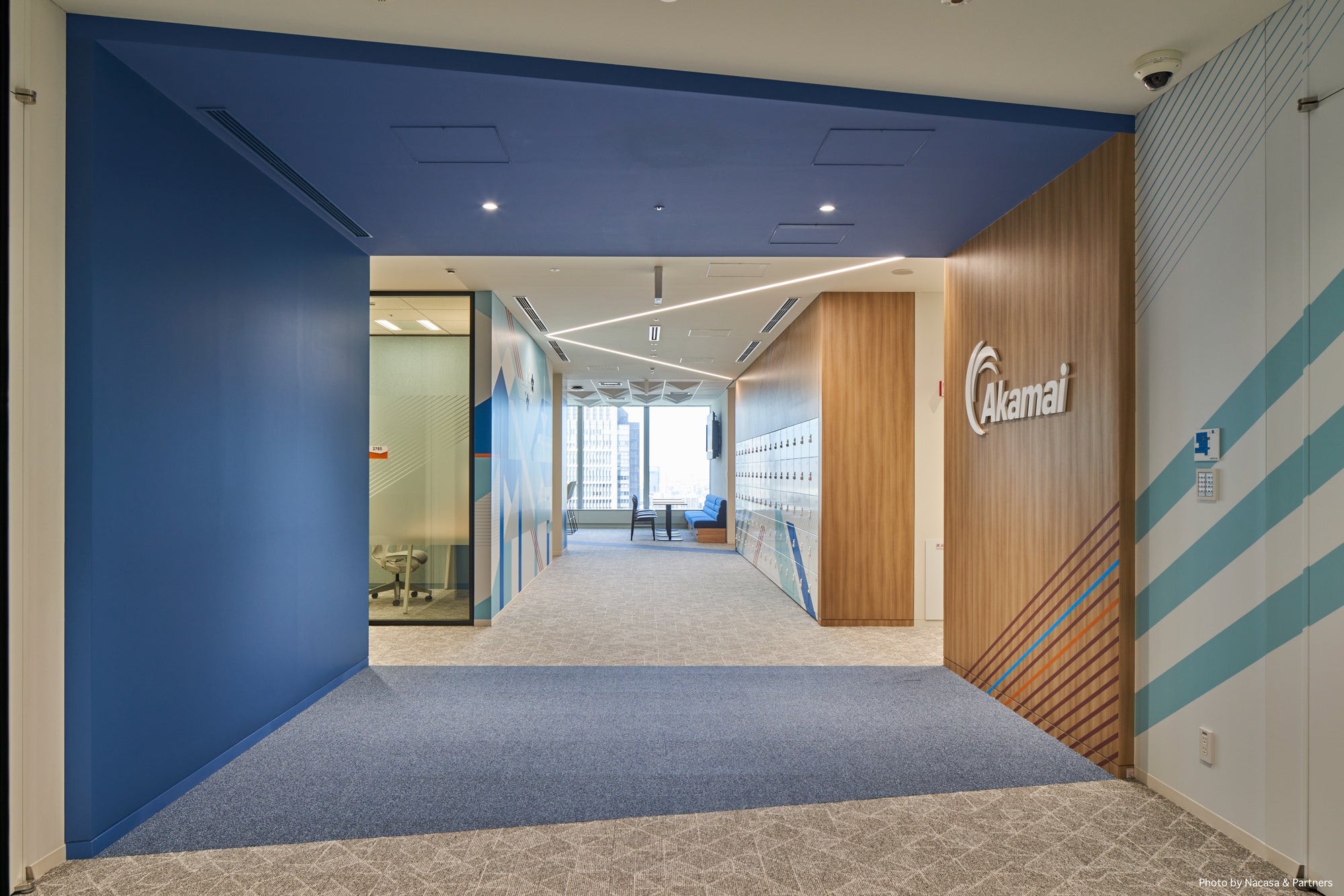 ・青のラインが、お客様向けの入口「Gate」から、コラボレーションエリアの中央を抜けて従業員用の入口「Portal」をつないでいます。これは2019年に竣工した Akamai 本社ビルのAkaMileと呼ばれる、建物内をつなぐ光とカラーラインの意匠から着想したもので、つながりやネットワークを表現しています。