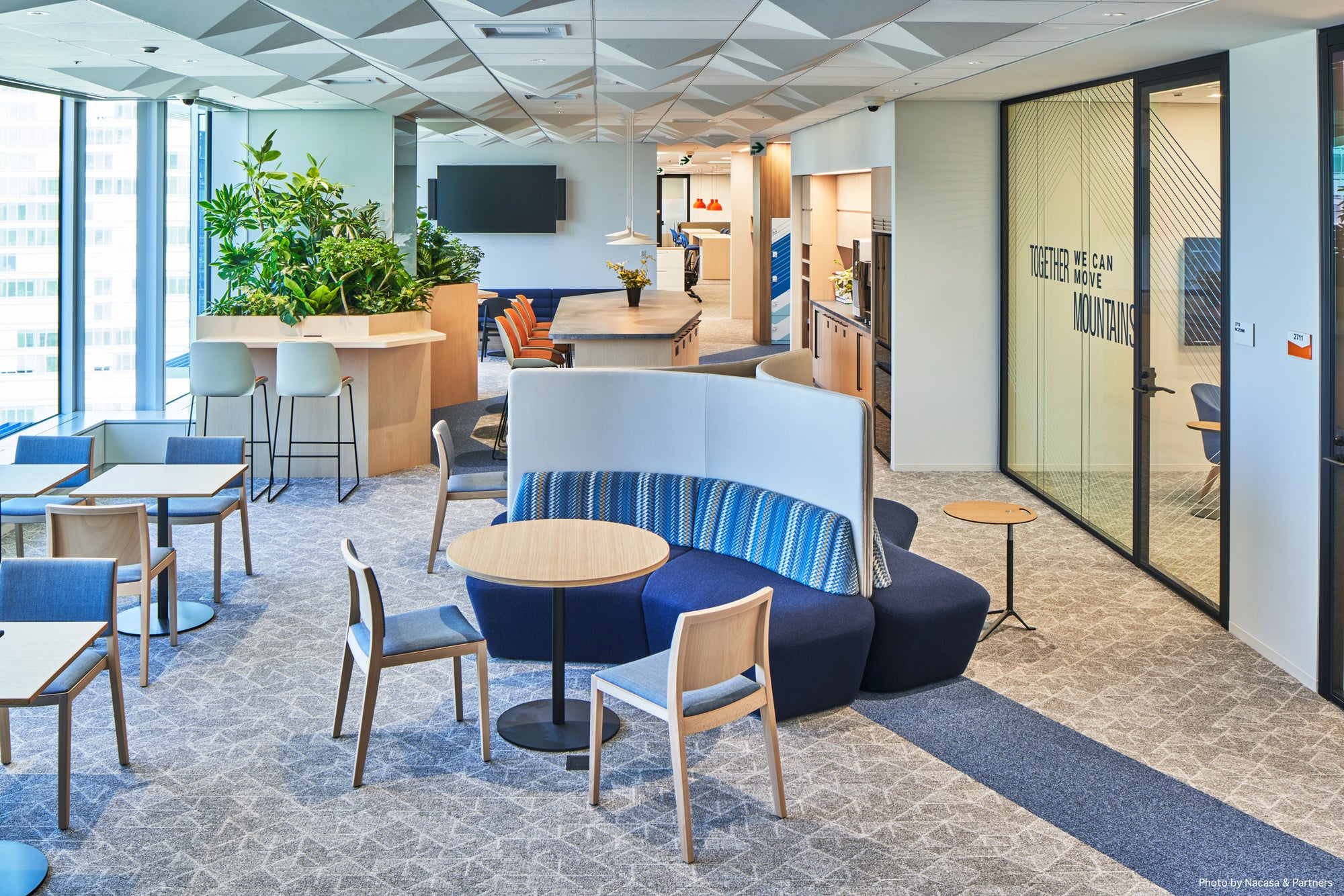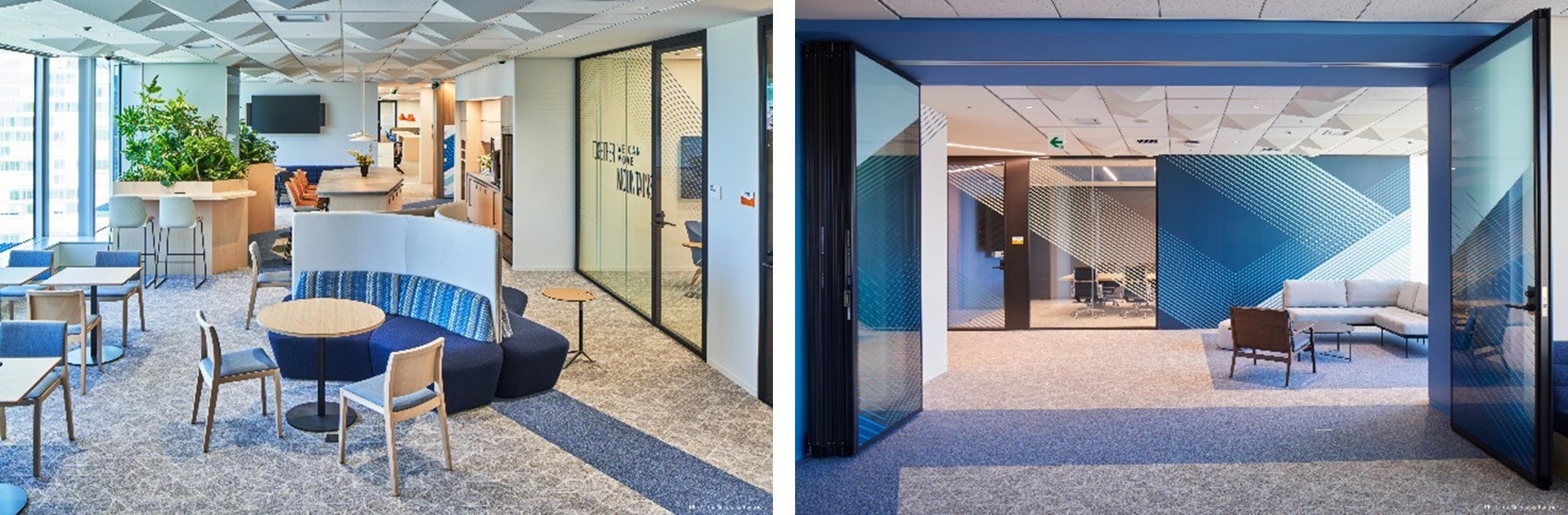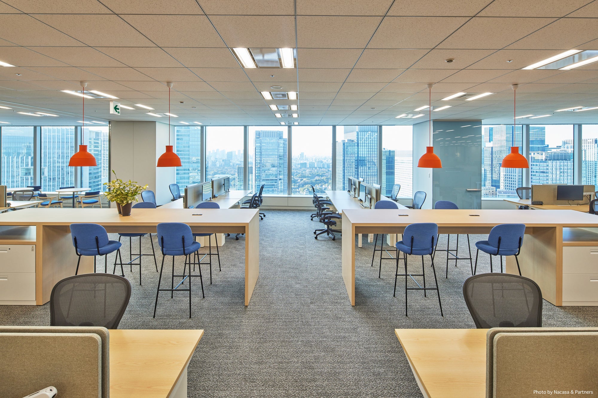 ・従業員用の入口の壁には、日本や東京をイメージする意匠を配し、洗練されたカフェ兼ワークスペースに誘導するなど、東京駅を間近に見下ろせるオフィスに出勤した従業員に活力を与え、対面によるコラボレーションや生産性の高い活動を促すための楽しい仕掛けを随所に散りばめています。