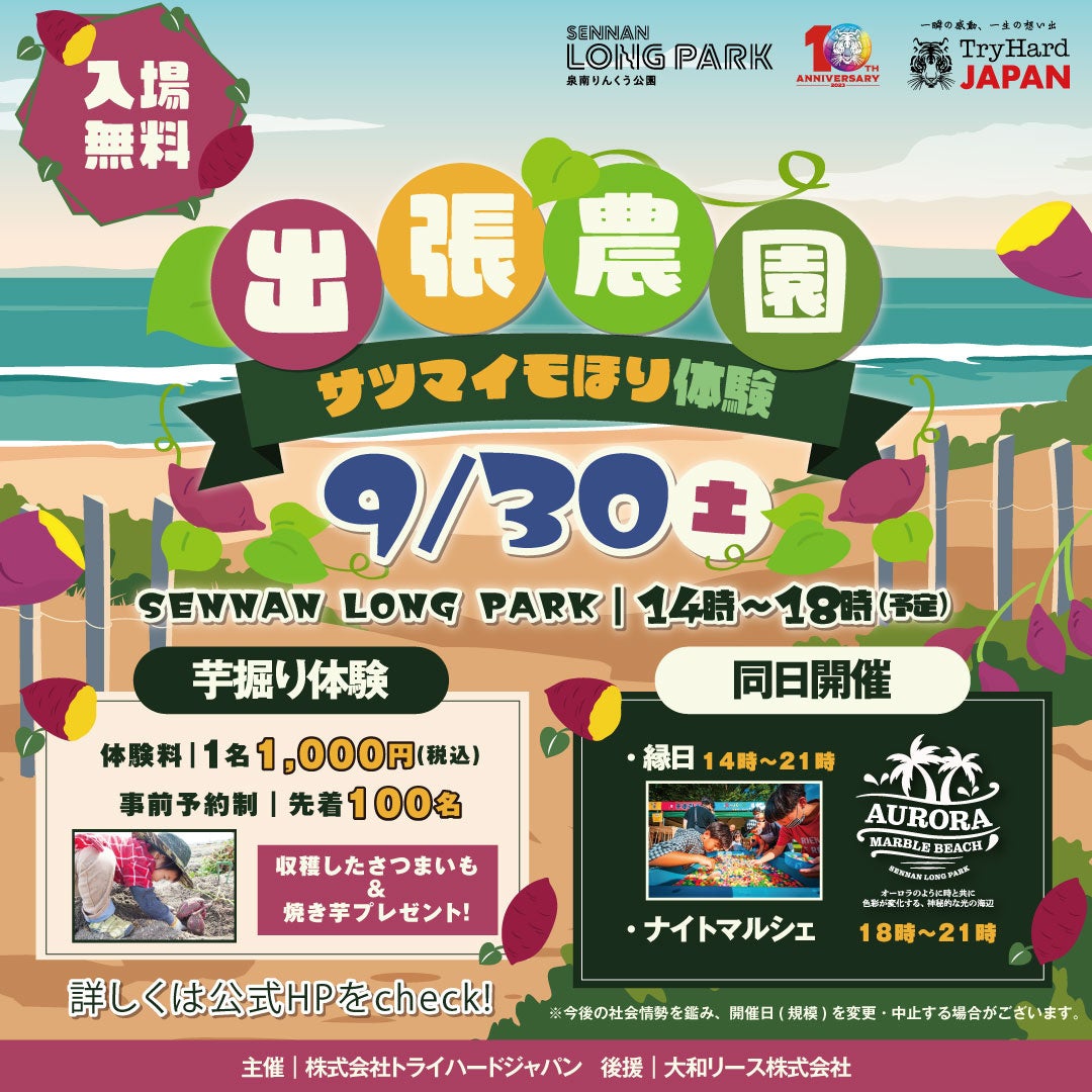 株式会社トライハードジャパン(所在地:大阪市中央区)は、2023年9月30日(土)にSENNAN LONG PARK(センナンロングパーク)(所在地:大阪府泉南市)海のマルシェにて、「出張農園~さつまいも堀り体験~&Aurora Mable Beach」を実施いたします。