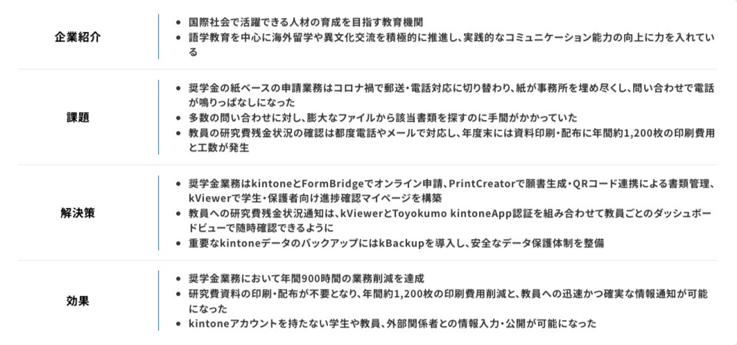 ▲出典:kintone連携サービス by トヨクモ 【教育業界】年間900時間の業務・印刷費削減、FormBridge・PrintCreatorを活用した関西外国語大学の業務改善事例