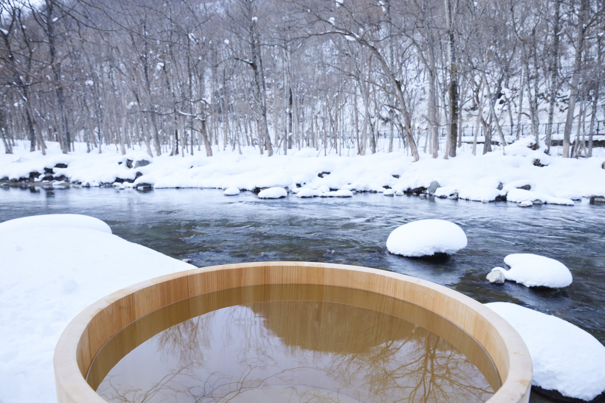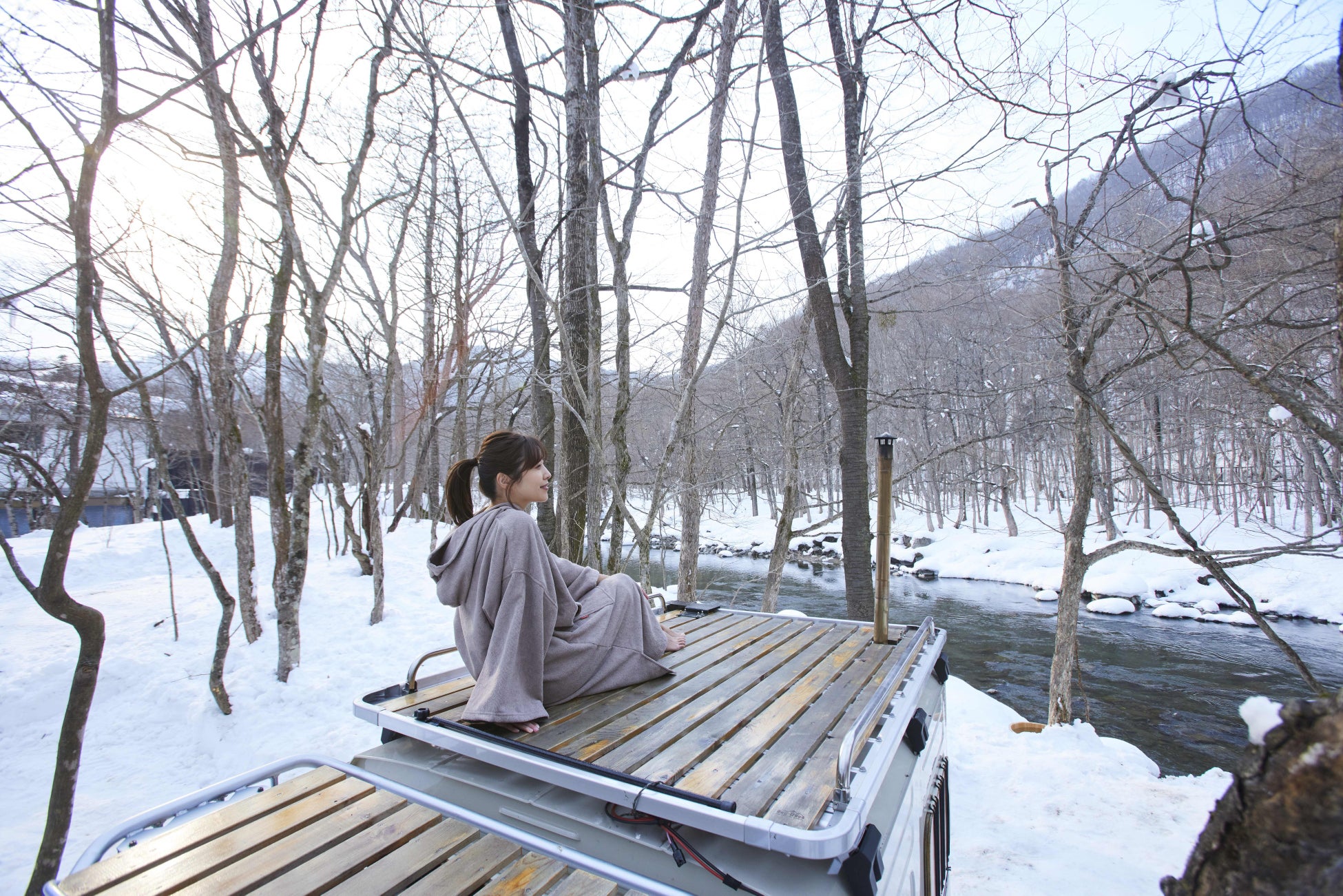 体を十分に温めた後は、高さ約2mの渓流を見下ろす特等席で、外気浴を思う存分楽しめます。他には誰もいないプライベートな空間で、静かに雪が降りしきる渓流の景色を独り占めする贅沢を味わえます。しんと静まり返った森の中で、火照った体を冷まし心身をリフレッシュさせる時間は、この上ない至福のひとときです。