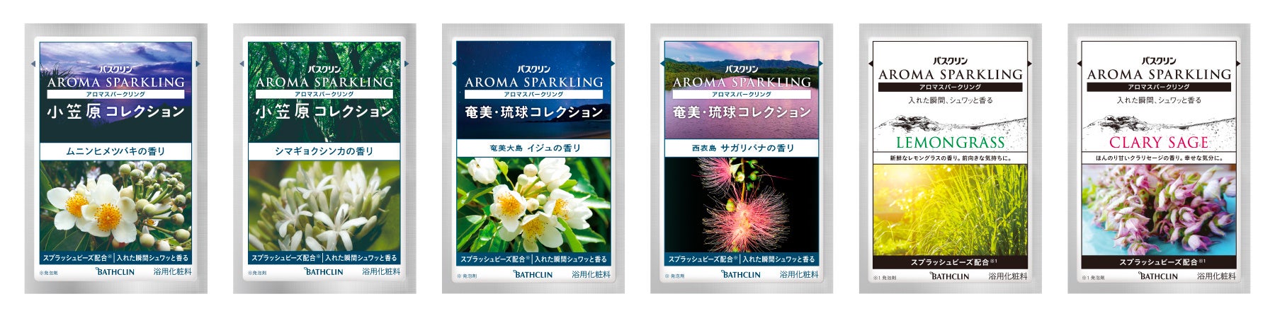 本品は、6種類の香りを詰め合わせたアソートセットです。4種は日本の自然遺産である小笠原諸島・奄美大島・西表島をイメージした香りで構成されており、当社の調香師が実際に現地を訪れ、固有植物の香りを体感・採取・分析して開発したオリジナル香料を配合しています。2種は、天然のレモングラスとクラリセージから採取したエッセンシャルオイル(香料)を配合した上質な香りです。さらに、入浴料の特長として、お湯に入れた瞬間に発泡する「スプラッシュビーズ®」(発泡剤)の配合により、香りが瞬時に拡散し、浴室全体に広がります。