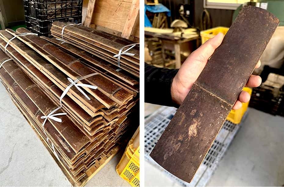 さらに注目すべきは「炭化加工」です。これは、竹を高温高圧で蒸し焼き状態にすることで、防虫・防カビ効果を高める加工方法。薬剤などは一切使わず、竹の内部までじっくりと熱を通すことで、深みのある茶褐色の色合いと、使うほどに味わいが増す風合いを生み出しています。