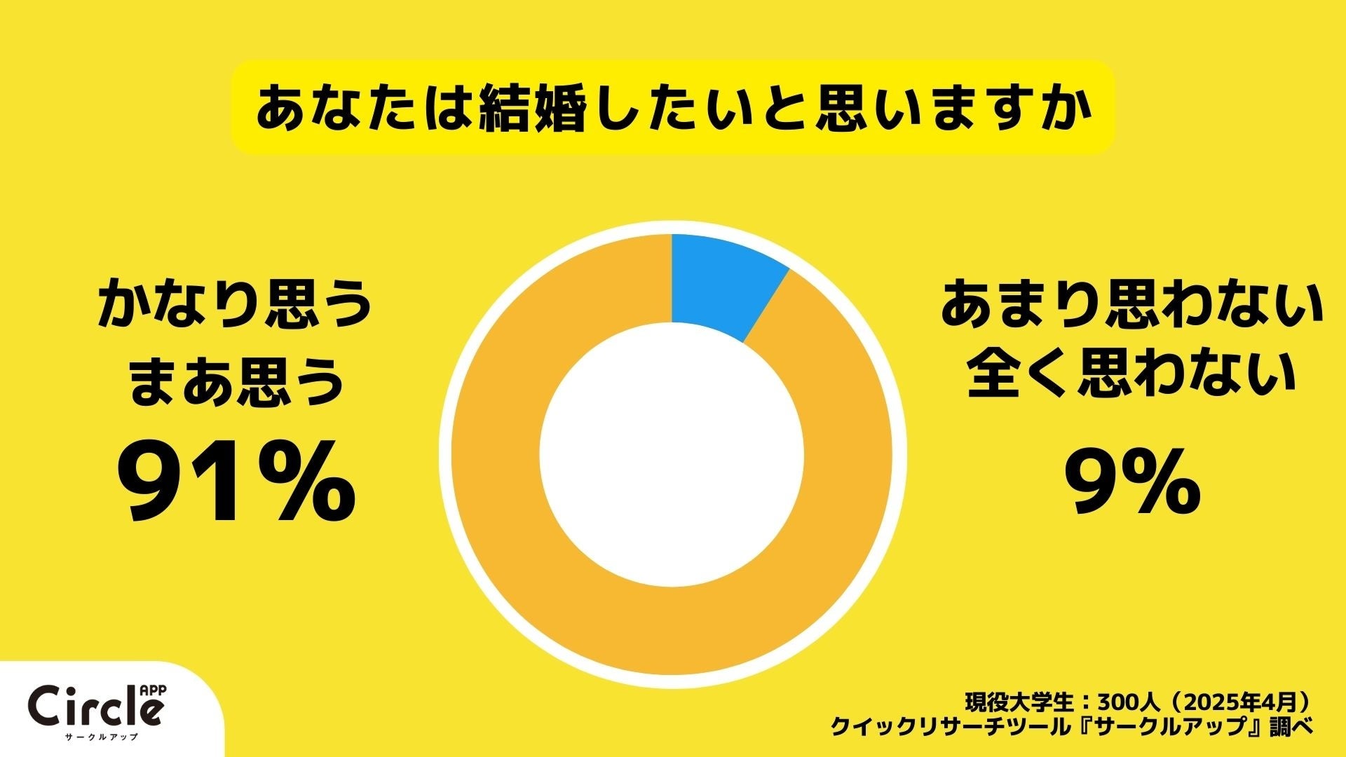 「あなたは結婚したいとおもいますか」という質問に対しては90%以上の若者が前向きな反応を示しました。若者の結婚願望が低くなっているのではないかという声がある一方でこのような回答が得られたのは非常に興味深いものだと考えられます。