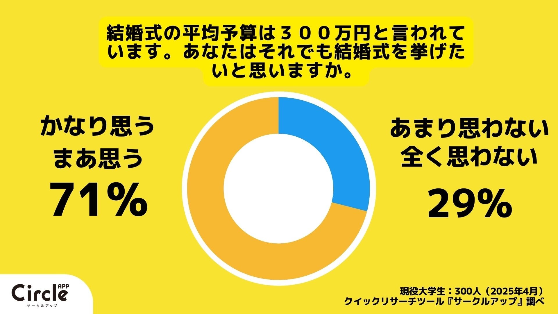 続いて決して安いとは言えない300万円という結婚式の平均予算を提示したうえで、「それでも結婚式を挙げたいか」という旨の質問をしたところ、7割を超える若者が結婚式を挙げることに前向きな姿勢であることが判明しました。前回の質問から数値自体は下がっていますが、「結婚はしたいが、結婚式に価値を感じない」という層が一定数いることを考慮すると、それなりに高い数値ではないでしょうか。