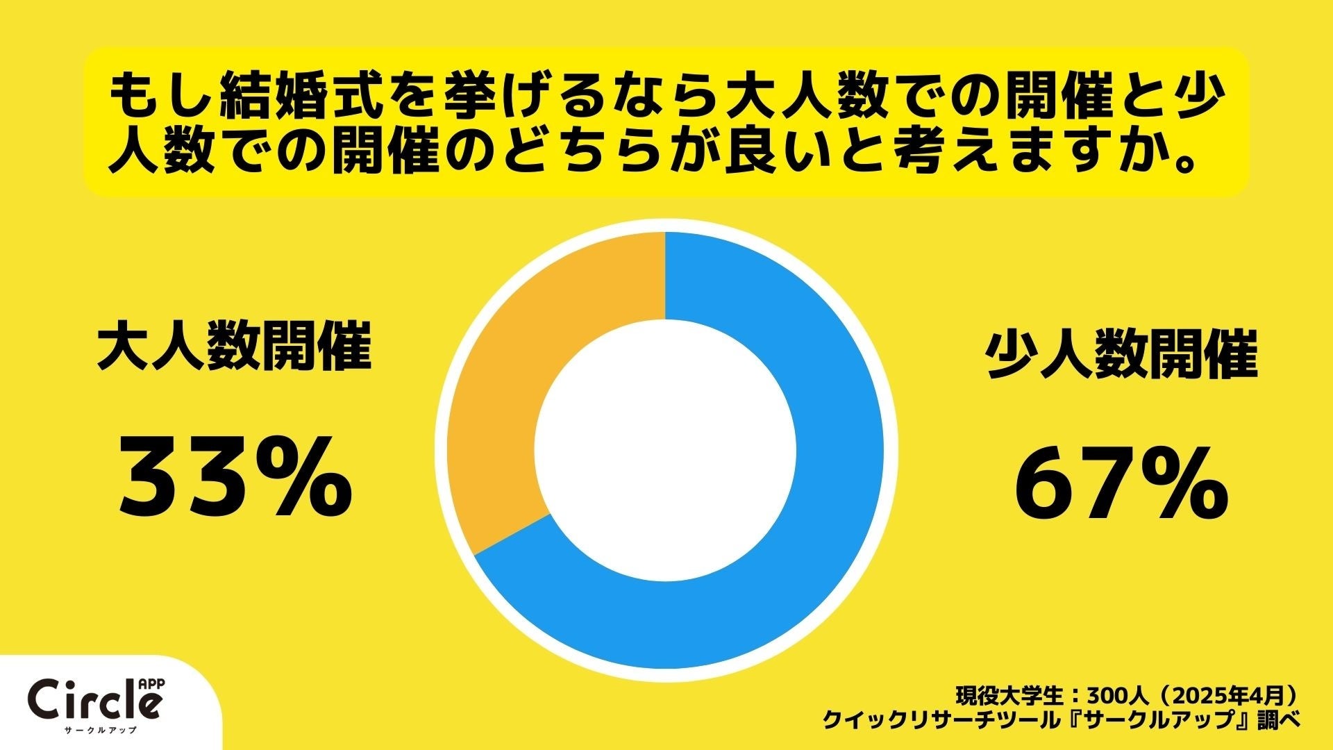 結婚式は大人数で開催したいという層は33%にとどまり、少人数開催派が7割近くを占める結果になりました。