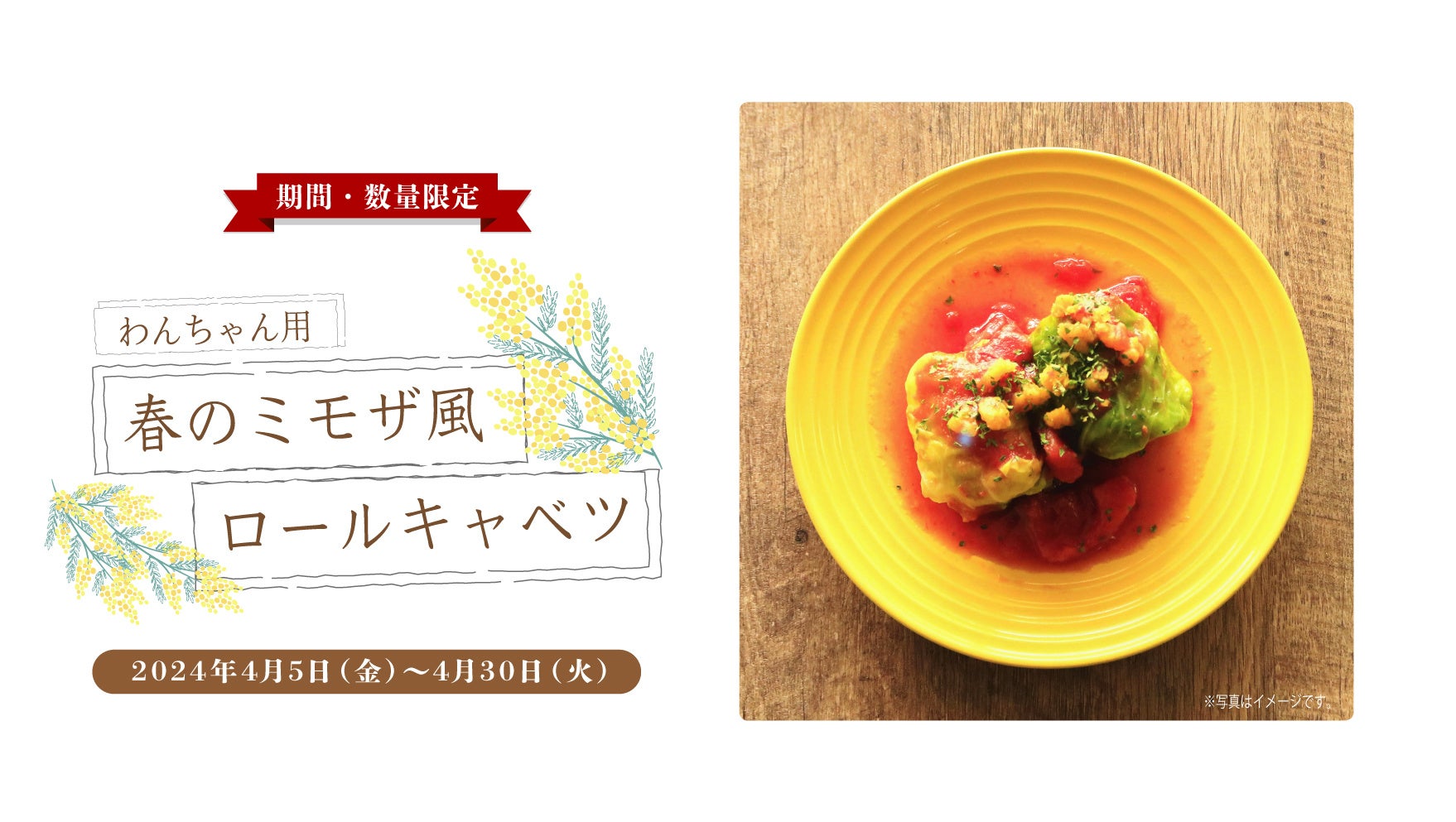 このたび、春の季節に合わせ季節限定わんちゃん用フード『春のミモザ風ロールキャベツ』を発売いたします。