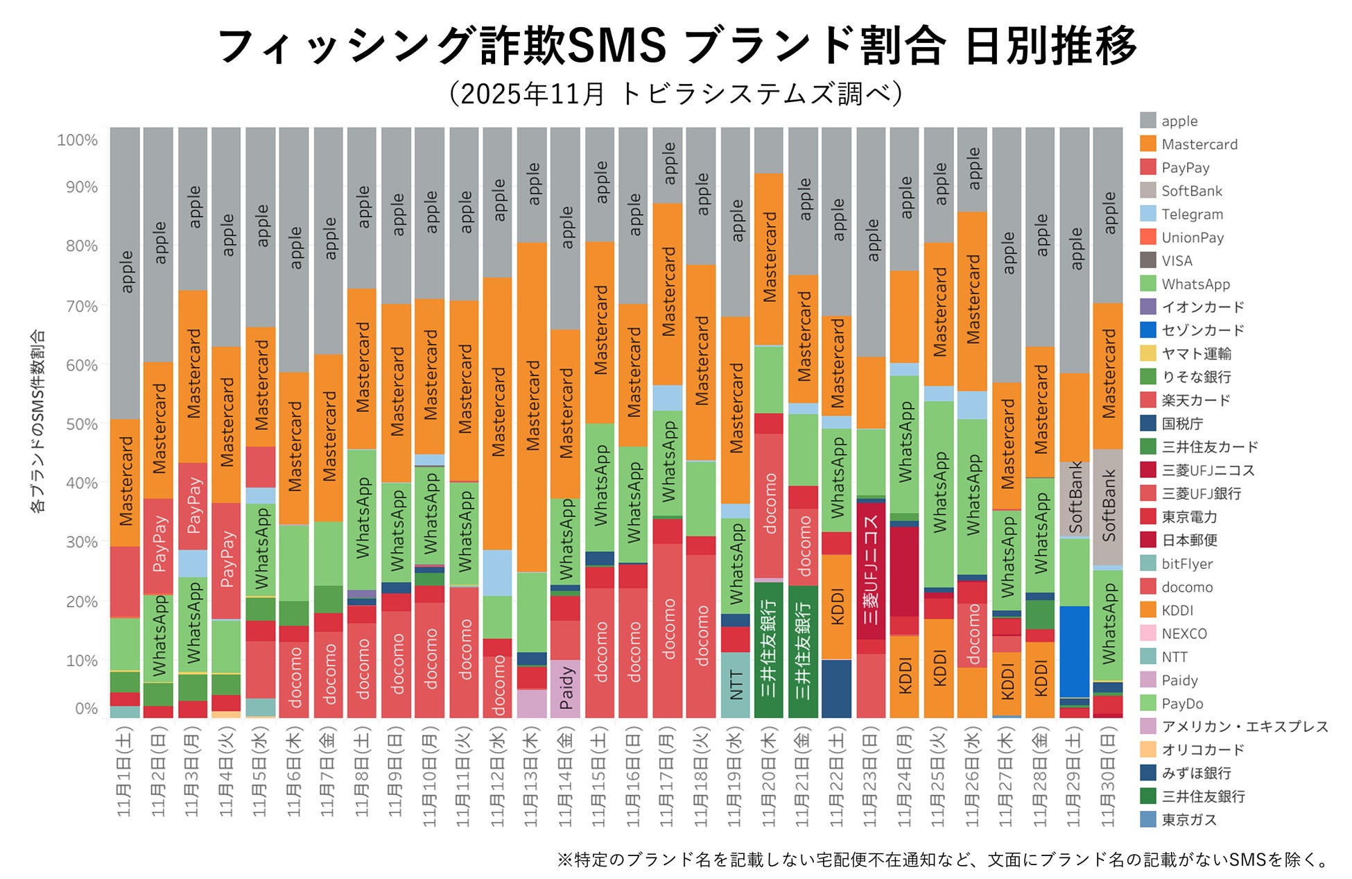 実在する企業やブランドをかたるSMSについて、2025年11月は「Apple」をかたるSMSが急増し、1か月を通じて発生が確認されました。通信事業者をかたる手口については、「docomo」をかたるSMSが多発しました。クレジットカード会社「Mastercard」や、メッセージアプリ「WhatsApp」をかたるSMSは、前月に引き続き多発が続いています。