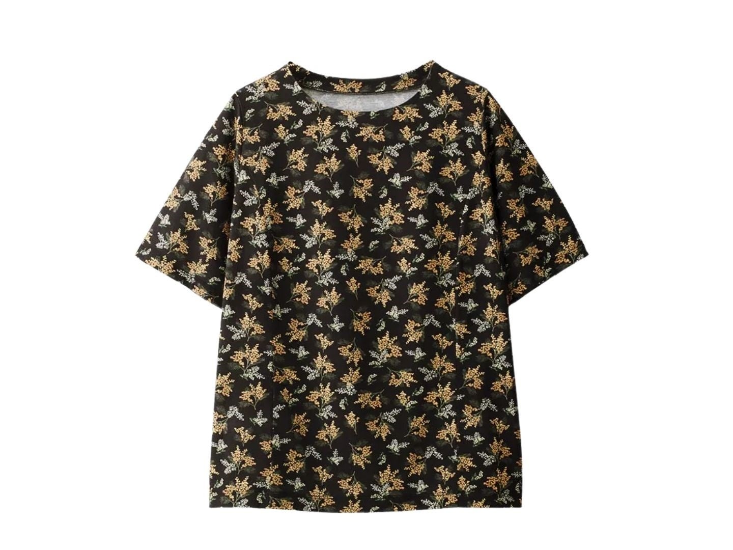 リバティプリントの繊細な色柄と、つやのある上品な綿素材で、Tシャツなのにきちんと見え。さらにシンプルな丸襟がフェイスラインをすっきり見せて、脇の立体マチで体型カバーも叶う、大人にうれしい一枚です。洗濯機で洗えます。
