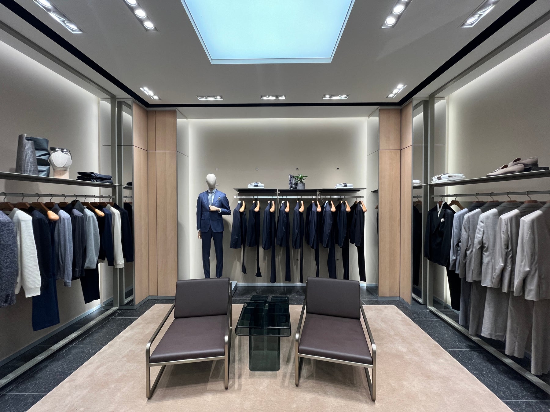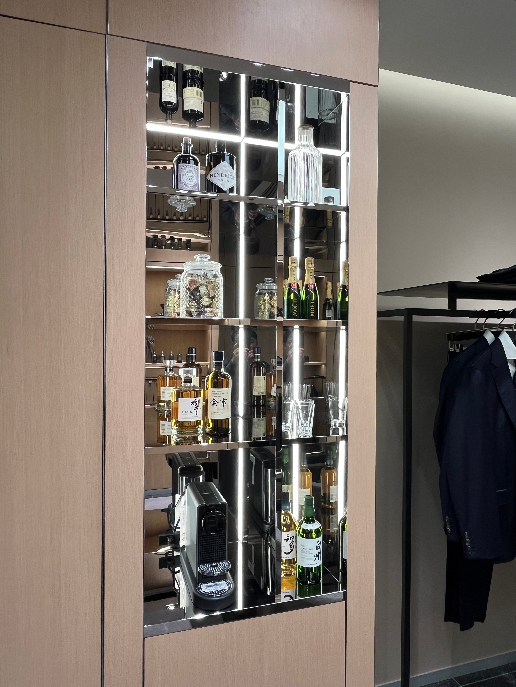 BOSS ストア 六本木ヒルズは、2フロア構成で総面積約452㎡を誇るモダンで光あふれる空間です。天井高を活かした開放感あふれる1階と、プライベートサロンを思わせる落ち着いた雰囲気の2階が、ダイナミックでありながら調和の取れた空間体験を創出します。ライトウッドを基調に、ストーンやマーブル、ブラックメタルのアクセントを組み合わせたインテリアは、エレガンスとコンテンポラリーなデザインのバランスというブランドの美学を表現しています。オープンファサードにより、店内のコレクションを一望できる設計とし、自信とスタイルを体現する空間へと誘います。今回のリニューアルでは、新たにバーカウンターを設置。BOSSのブランドコードに沿ったラグジュアリーなホスピタリティを提供します。
