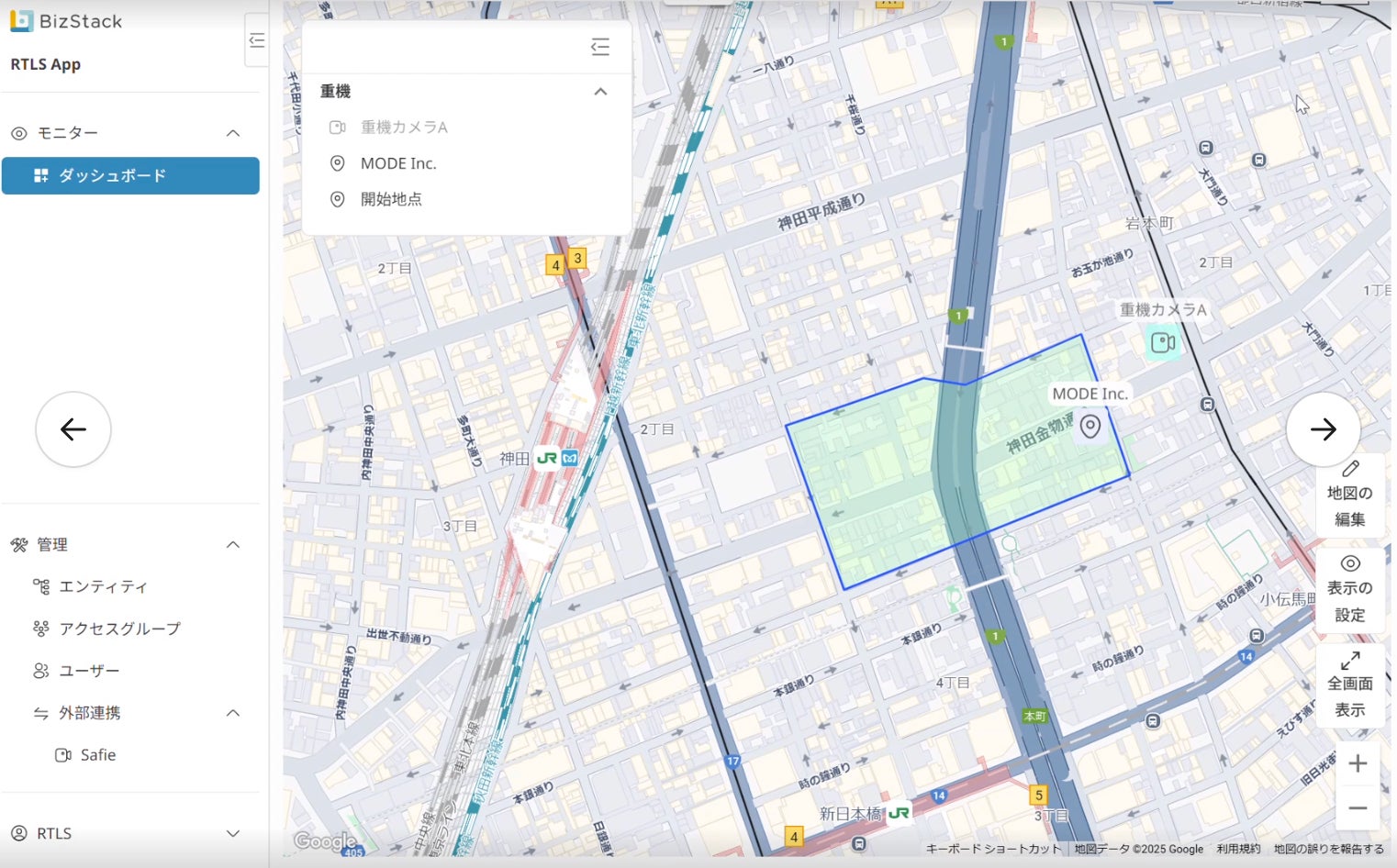 BizStackダッシュボード上で、ユーザーがマウス操作で自由な形状のエリアを描画可能。設定したエリアをそのままジオフェンスとして活用できます。
