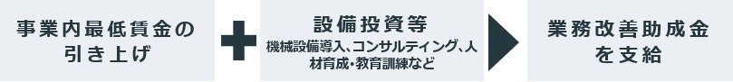 業務改善助成金は、生産性向上に資する設備投資等(機械設備、コンサルティング導入や人材育成・教育訓練)を行うとともに、事業場内最低賃金を一定額(各コースに定める金額)以上引き上げた場合、その設備投資などにかかった費用の一部を最大450万円助成するものです