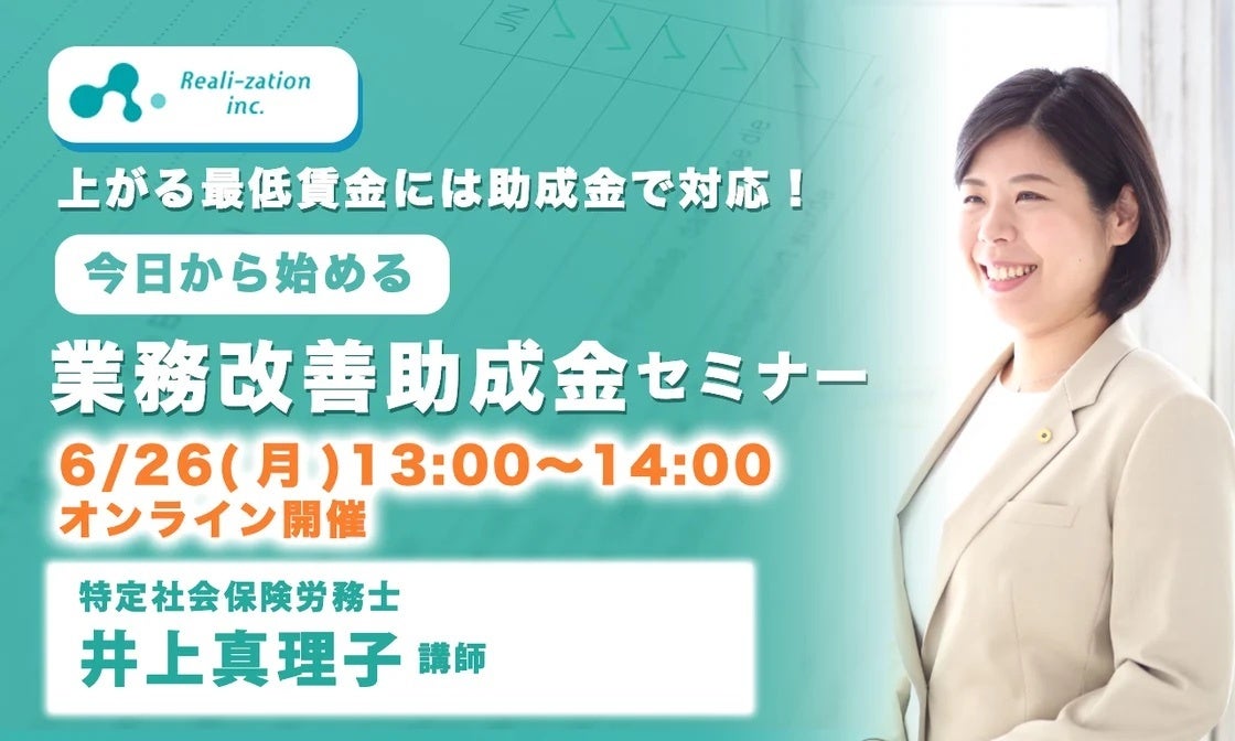 これまでに40億円以上補助金の申請総額と1,000件以上の申請を行ってきた株式会社リアリゼイション(住所:東京都渋谷区渋谷3-6-2エクラート渋谷ビル4F 代表取締役:森垣洋平)は、「今日から始める業務改善助成金活用セミナー」と題し、経験豊富な社労士を招き「業務改善助成金」のセミナーを開催いたします。