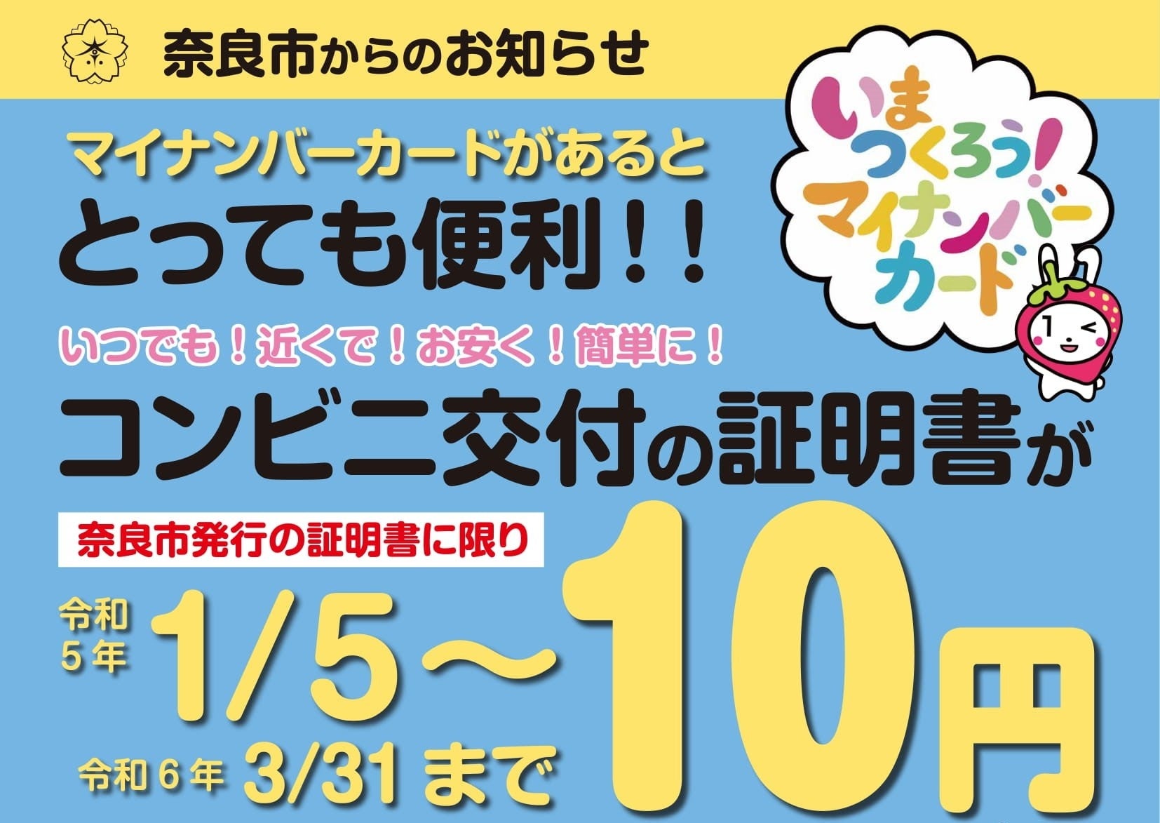 奈良市ではデジタル技術を活用し、行政サービスの利便性を高める取り組みを行っています。その一環として、令和5年1月5日から、コンビニエンスストアなどで証明書が取得できる「証明書コンビニ交付サービス」での証明書交付手数料を「一律10円」に引き下げます。