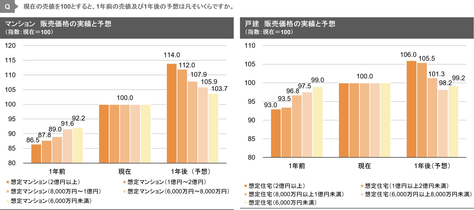 販売価格の実績と予想について、マンション市場では、いずれの価格帯でも価格上昇が続いており、販売価格が高いほど上昇率が高い傾向。一方、戸建市場では、価格帯によって販売価格の実績と予想に違いが生じている。「8,000万円以上1億円未満」以上の価格帯では上昇傾向だが、 上記未満の価格帯ではやや下落傾向と見られている。
