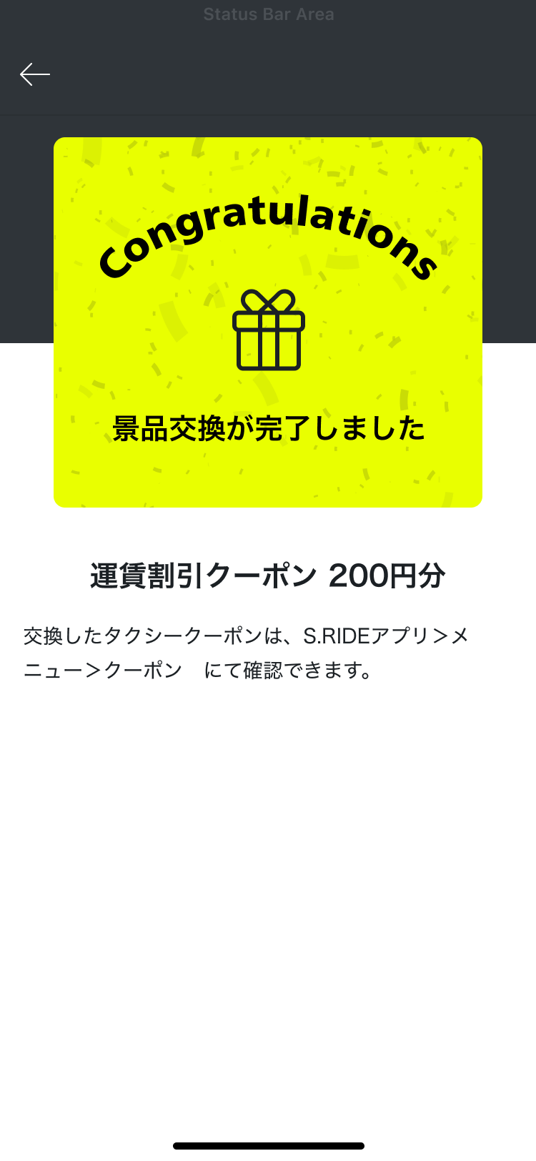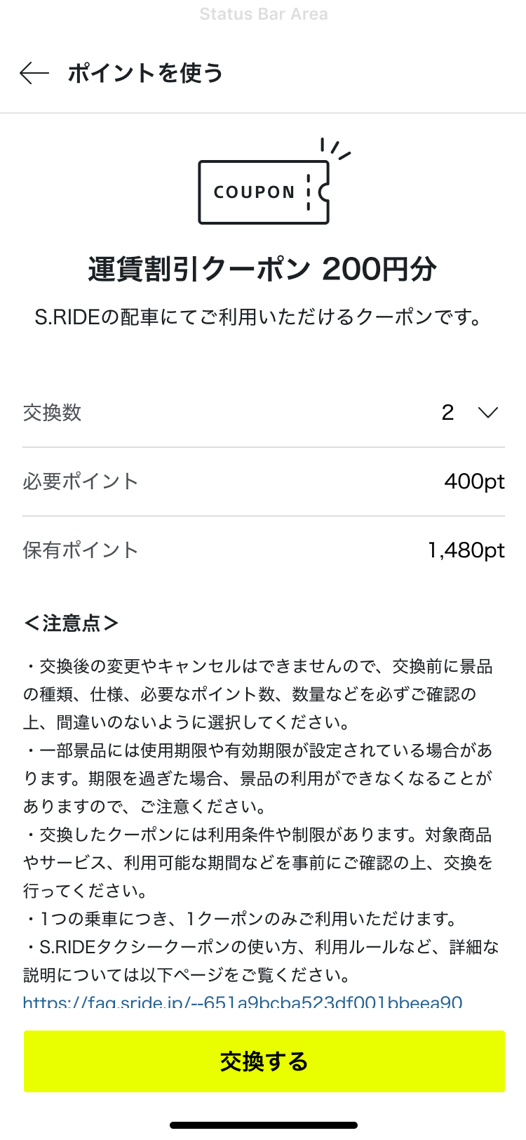 ポイント利用方法:アプリ内の景品交換ページより、ポイント数に応じたタクシークーポンと交換可能です。