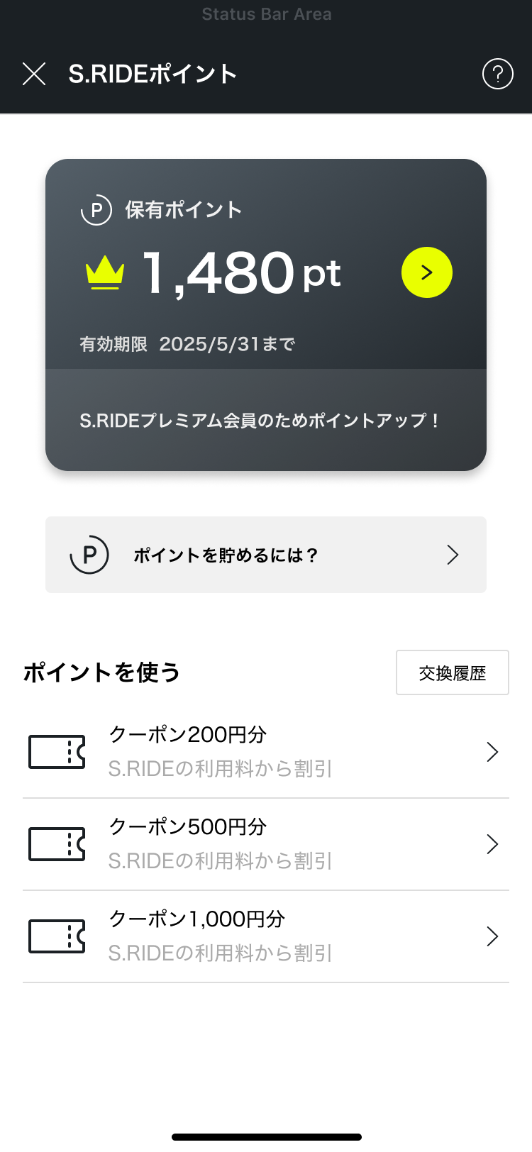 使用方法:S.RIDEアプリを通じた利用内容に応じて、自動的にポイントが付与され、アプリ上に反映されます。