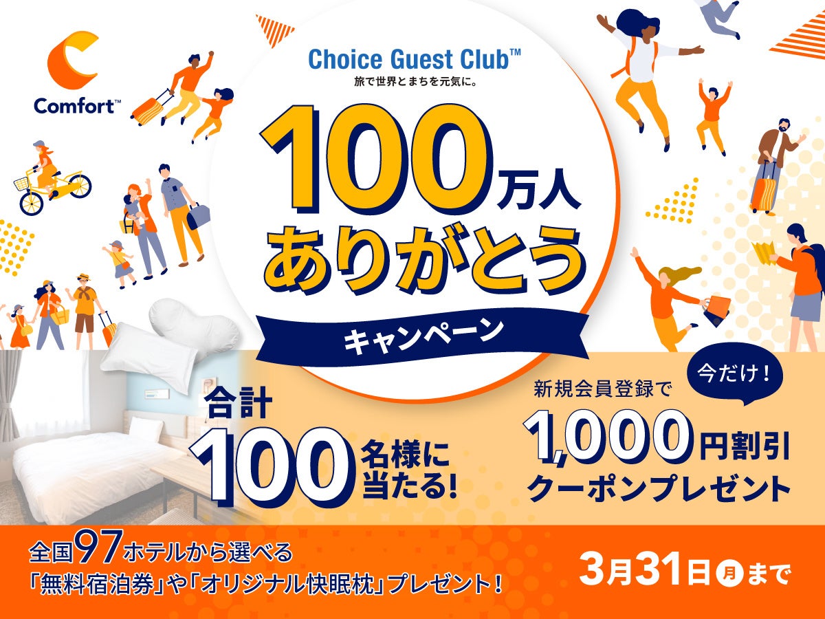 全国に「コンフォートホテル」「コンフォートホテルERA」「コンフォートイン」「コンフォートスイーツ」「Ascend Hotel Collection(TM)」を展開する株式会社チョイスホテルズジャパン(本社:東京都中央区、代表取締役社長:伊藤孝彦、以下チョイスホテルズジャパン)は、「旅で世界とまちを元気に。」をコンセプトに運営するコンフォートホテルの公式Webサイトの会員制度「Choice Guest Club(TM)」において、会員数が100万人を突破したことをお知らせいたします。会員数100万人突破を記念して、2025年3月4日(火)から2025年3月31日(月)の期間、会員を対象に、チョイスブランド全ホテルで使える無料宿泊クーポンやオリジナル枕などが抽選で総計100名様に当たる「Choice Guest Club(TM)会員100万人ありがとうキャンペーン」を実施します。