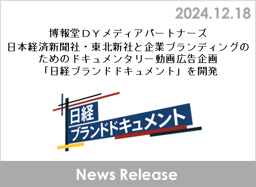 株式会社博報堂DYメディアパートナーズ(本社:東京都港区、代表取締役社長:矢嶋弘毅、以下博報堂DYメディアパートナーズ)は、株式会社日本経済新聞社(本社:東京都千代田区、代表取締役社長:長谷部 剛、以下日本経済新聞社)、株式会社東北新社(本社:東京都港区、代表取締役社長:小坂恵一、以下東北新社)とともに、ドキュメンタリー動画を制作・提供する広告企画「日経ブランドドキュメント」を開発いたしました。
