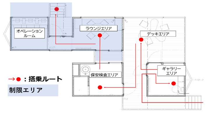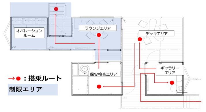 【ギャラリーエリア】空飛ぶクルマに関する展示を配置し、情報提供します。 【デッキエリア】展望スペースの設置により、搭乗客の期待感を高めます。 【保安検査エリア】顔認証システムによる自動チェックイン、保安検査等により、シンプルかつスムースな搭乗受付を実施します。 【ラウンジエリア】待合スペースやディスプレイを通じた空飛ぶクルマの運航状況や各種情報提供により、搭乗客に快適な待ち時間を提供します。 【オペレーションルーム】離着陸場の着陸エリア・駐機スポット、設備等の空き状況、周辺空域(天候、周辺を飛行する航空機)の監視等による運航支援 、チェックイン等の搭乗客の状況を一元的にシステム管理することで、離着陸場の安全かつ効率的な運用を支えます。 |