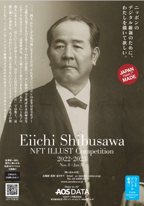 クラウドデータ、システムデータ、リーガルデータ、AIデータなどのデータアセットマネジメント事業を展開するAOSデータ株式会社(本社:東京都港区、代表取締役社長 春山 洋、以下AOSデータ社)は、日本企業のDX推進の基盤となる安全なデータ交換を早期に実現させるため、デジタル維新のアイコンとして、渋沢栄一翁のNFTイラストを募集する開催中の「今こそデジタル維新!澁澤榮一翁NFTイラストコンテスト」の審査員に、日本郵便の切手デザイナー 中丸ひとみ氏が参画し、募集期間を2023年1月31日までとすることをお知らせします。NFTイラスト募集要項や、応募はこちらまでhttps://twitter.com/JAPANMADE3