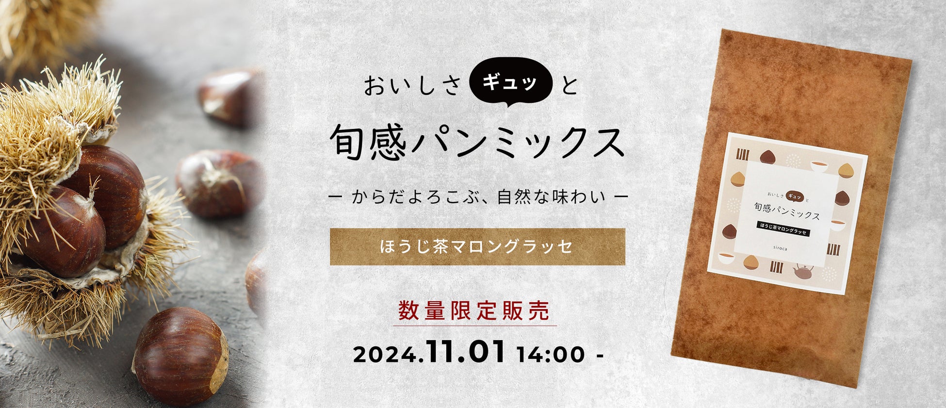 第3弾となる今回は、秋の味覚を楽しめるフレーバーをご用意。マロングラッセの甘みにふわりと広がるほうじ茶の香りが合わさった「ほうじ茶マロングラッセ」を、シロカオンラインストア本店にて数量限定で発売します。今後も、四季折々の旬の食材を使ったパンミックスをお届けしていきます。
