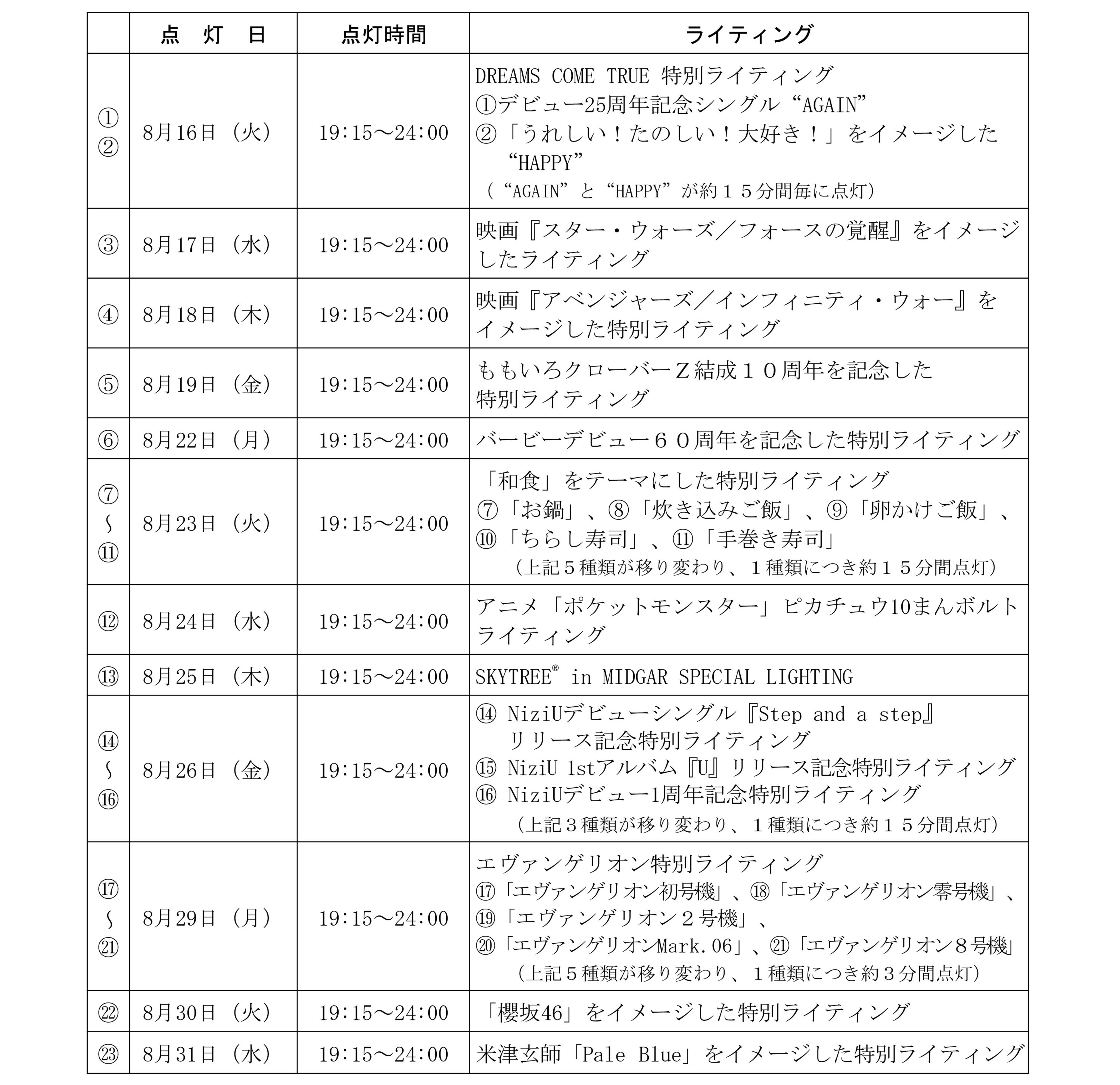 東京スカイツリーは2012年5月22日の開業以降、東京の夜を彩るライティングを点灯しており、通常ライティング「粋」「雅」「幟(のぼり)」をはじめ、シーズンごとに特別なデザインのライティングを点灯して東京の季節の演出や、東京スカイツリーで開催するイベントに合わせ、その世界観やキャラクターをイメージしたライティングを点灯してきました。
