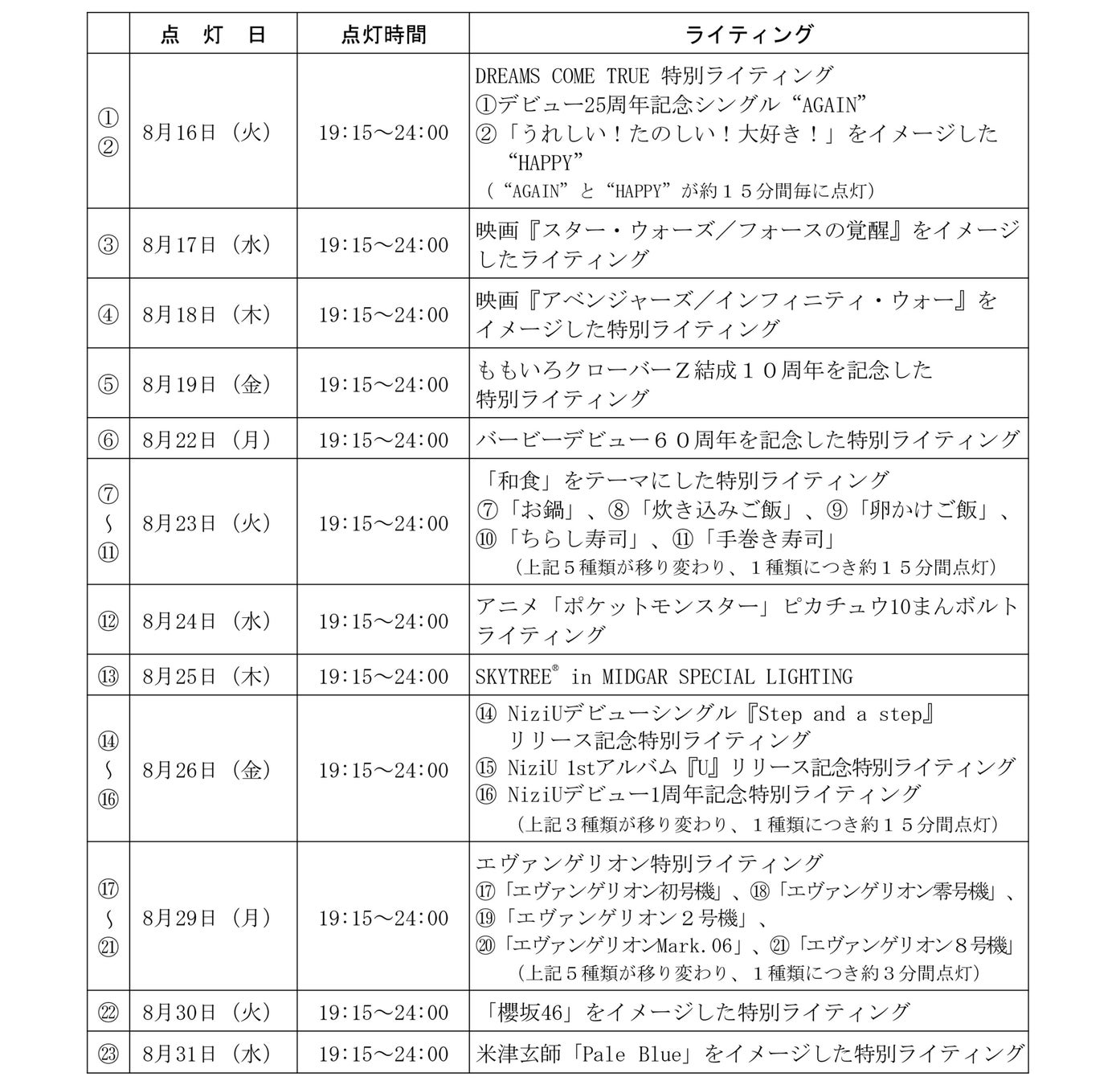 ※内容や点灯日時は予告なく変更する可能性があります。